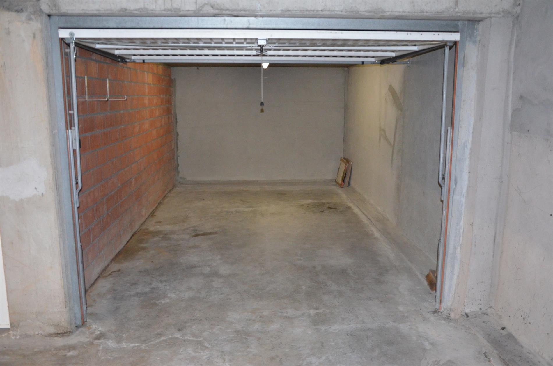 Ruime garage met kantelpoort, verlichting en stopcontact.
