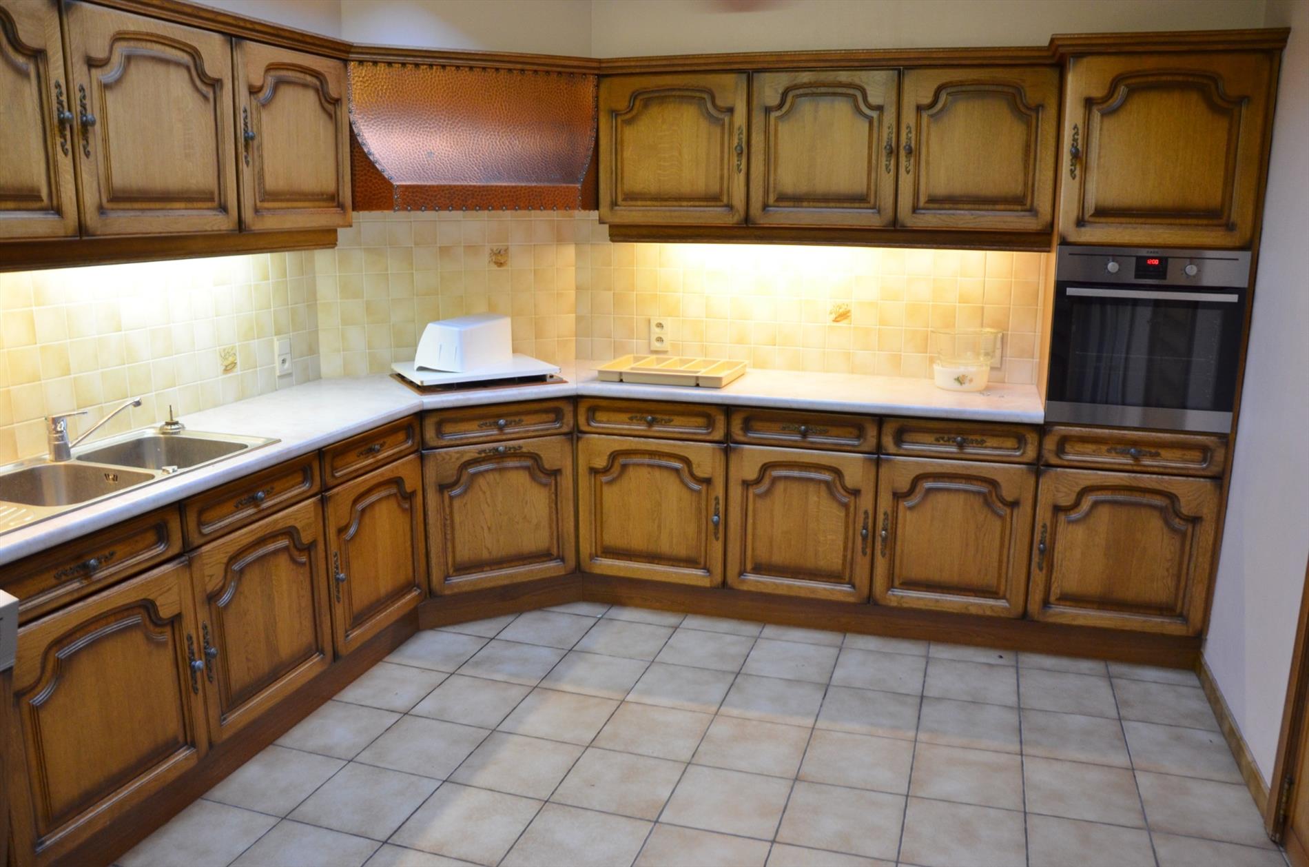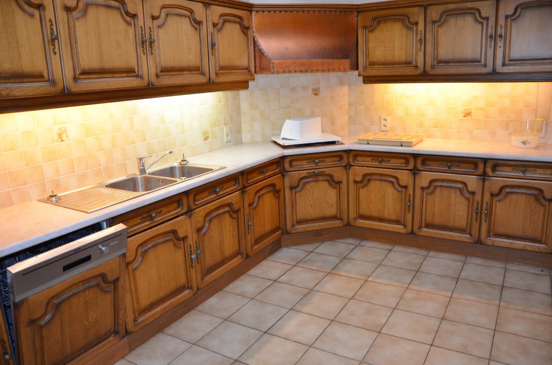Gang - slaapkamer 1 - ingerichte badkamer met dubbele wastafel en ligbad - apart toilet - slaapkamer 2 - slaapkamer 3 - bureau - ruime leefruimte - ingerichte keuken met o.a. een oven, vaatwas, koelkast, dubbele spoelbak, gasfornuis en dampkap - wasruimte/berging.