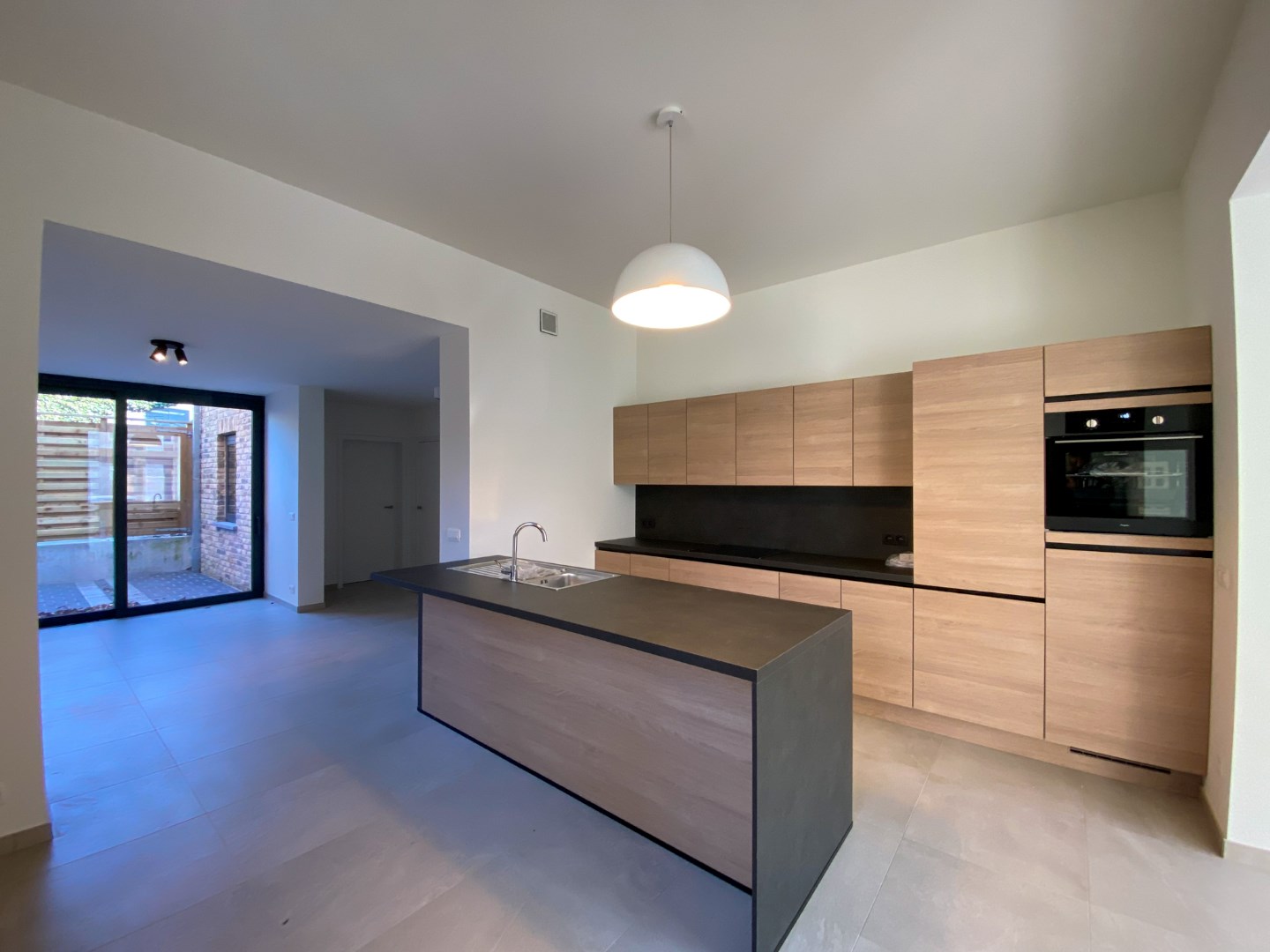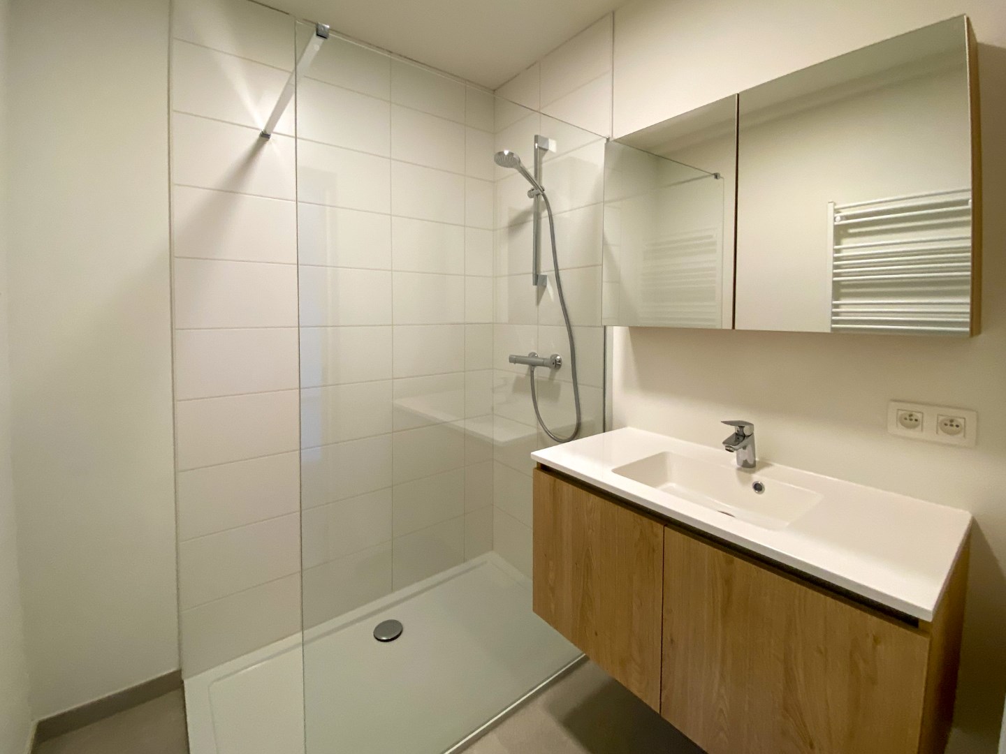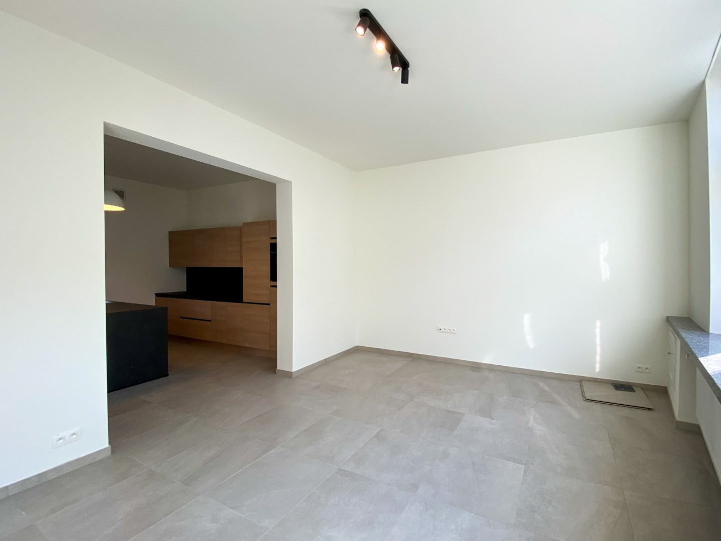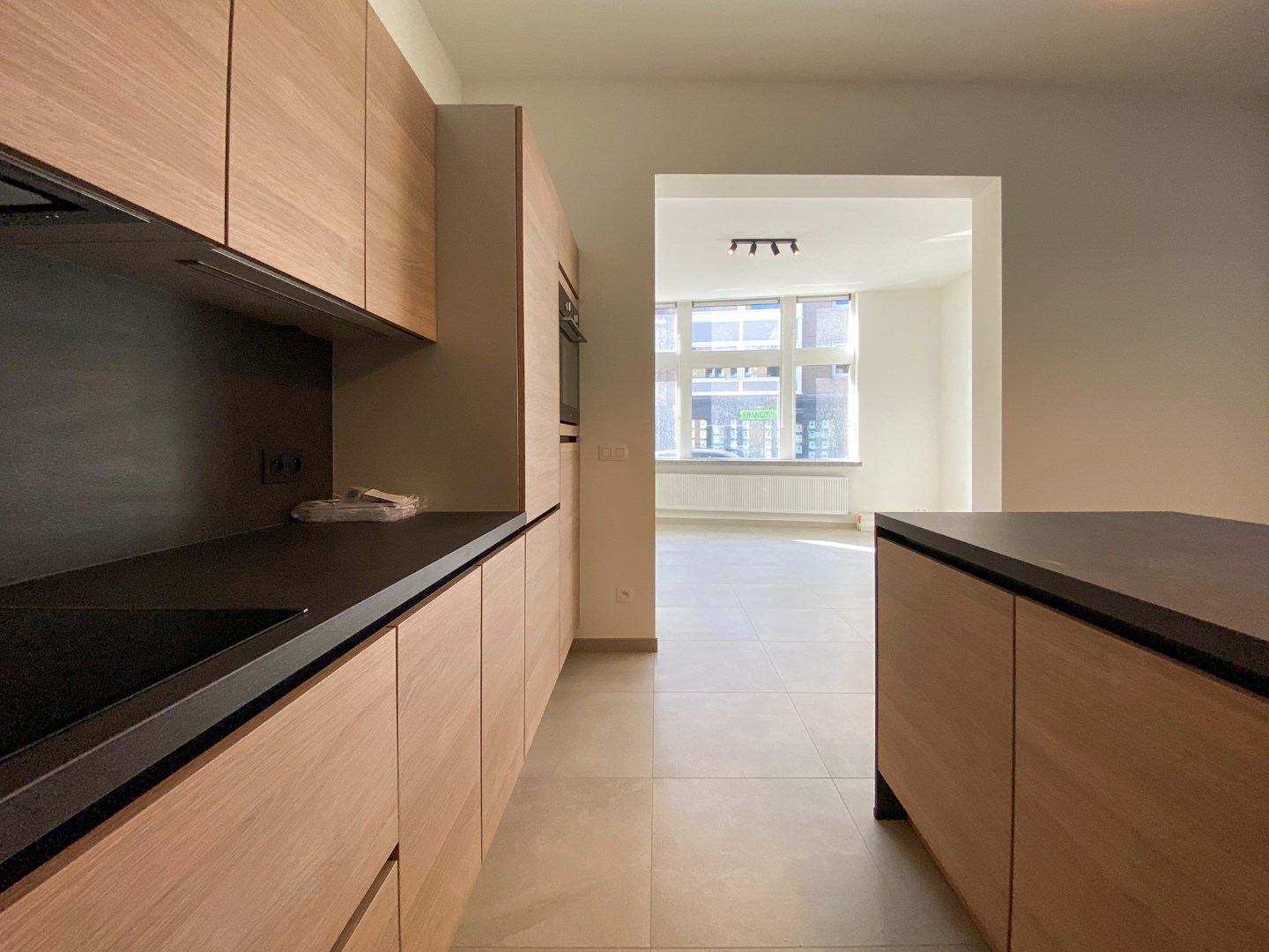 Gemeenschappelijke inkomhal - inkomhal appartement - apart toilet - eetkamer - 1 slaapkamer - ingerichte badkamer met ruime inloopdouche en lavabomeubel - ingerichte keuken met eiland bevat o.a. een elektrische kookplaat, dampkap, ruime koelkast, microgolf en oven - leefruimte - stadskoertje.