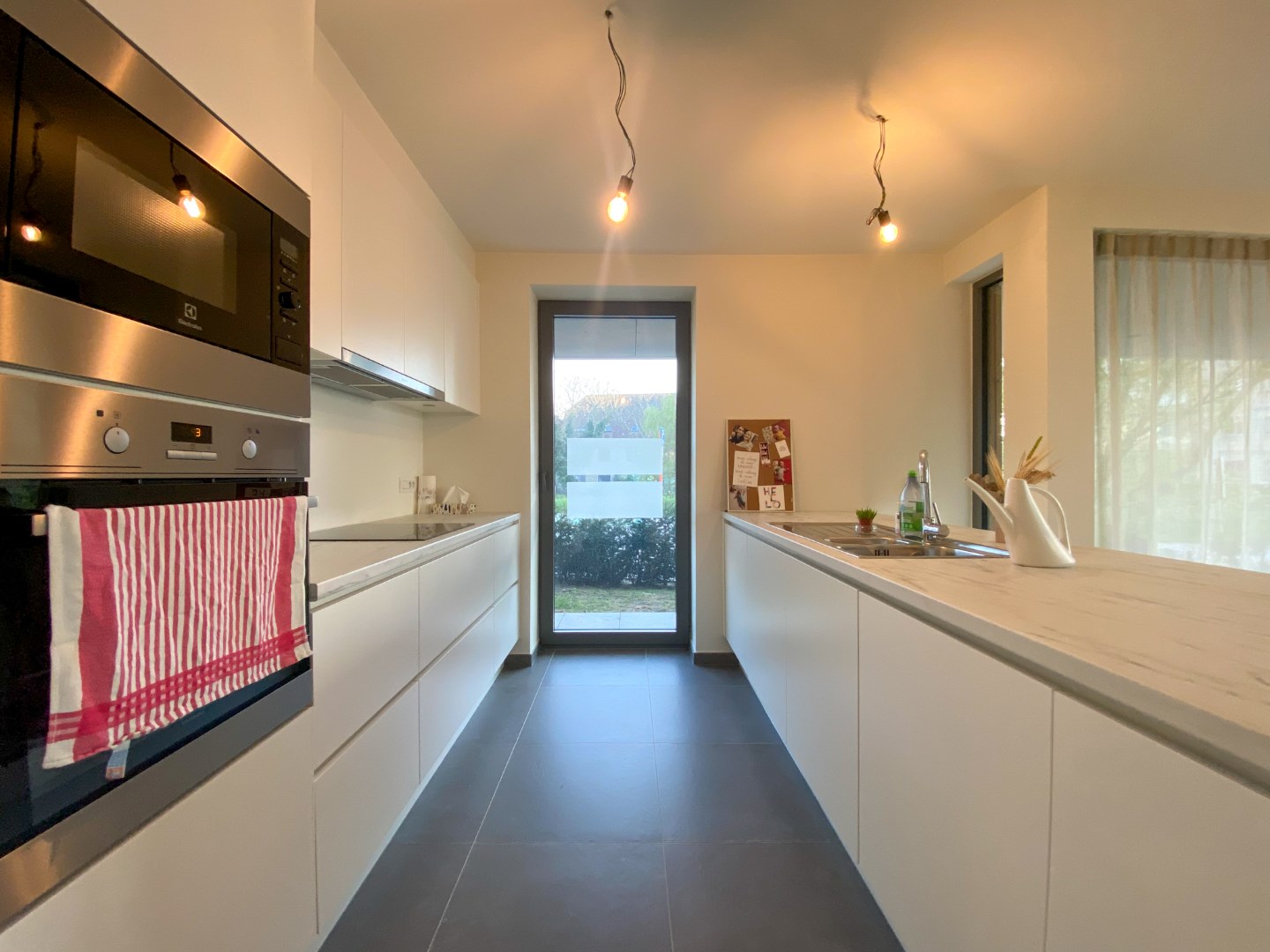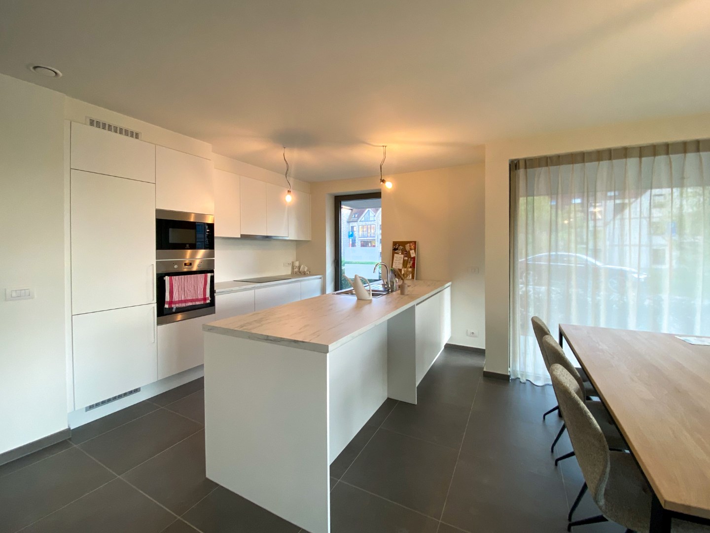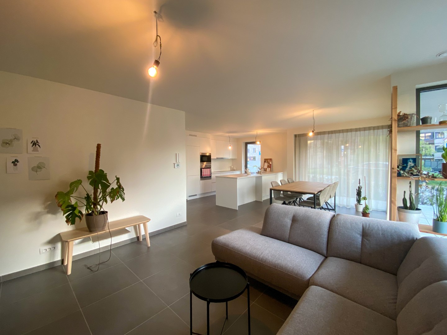 Gemeenschappelijke inkomhal - inkomhal appartement - ingerichte badkamer met inloopdouche, toilet en wastafel - slaapkamer - lichtrijke leefruimte met open ingerichte keuken en eiland, bevat o.a. spoelbak, inductie kookplaat, dampkap, koelkast, diepvries, vaatwas, oven en combi-oven - berging - aangename tuin (30m²) met ruim terras.