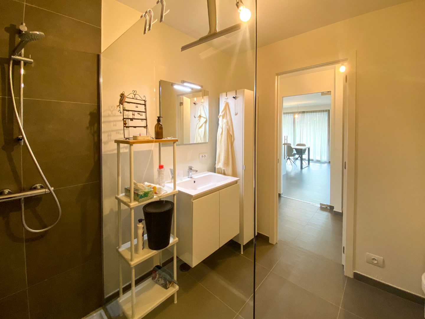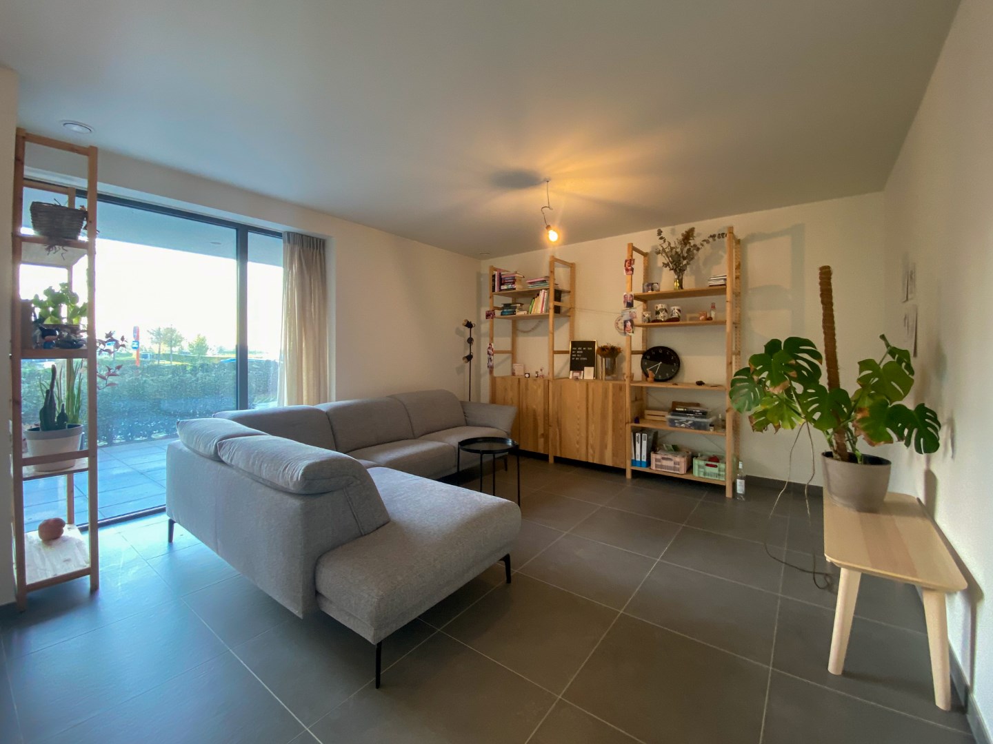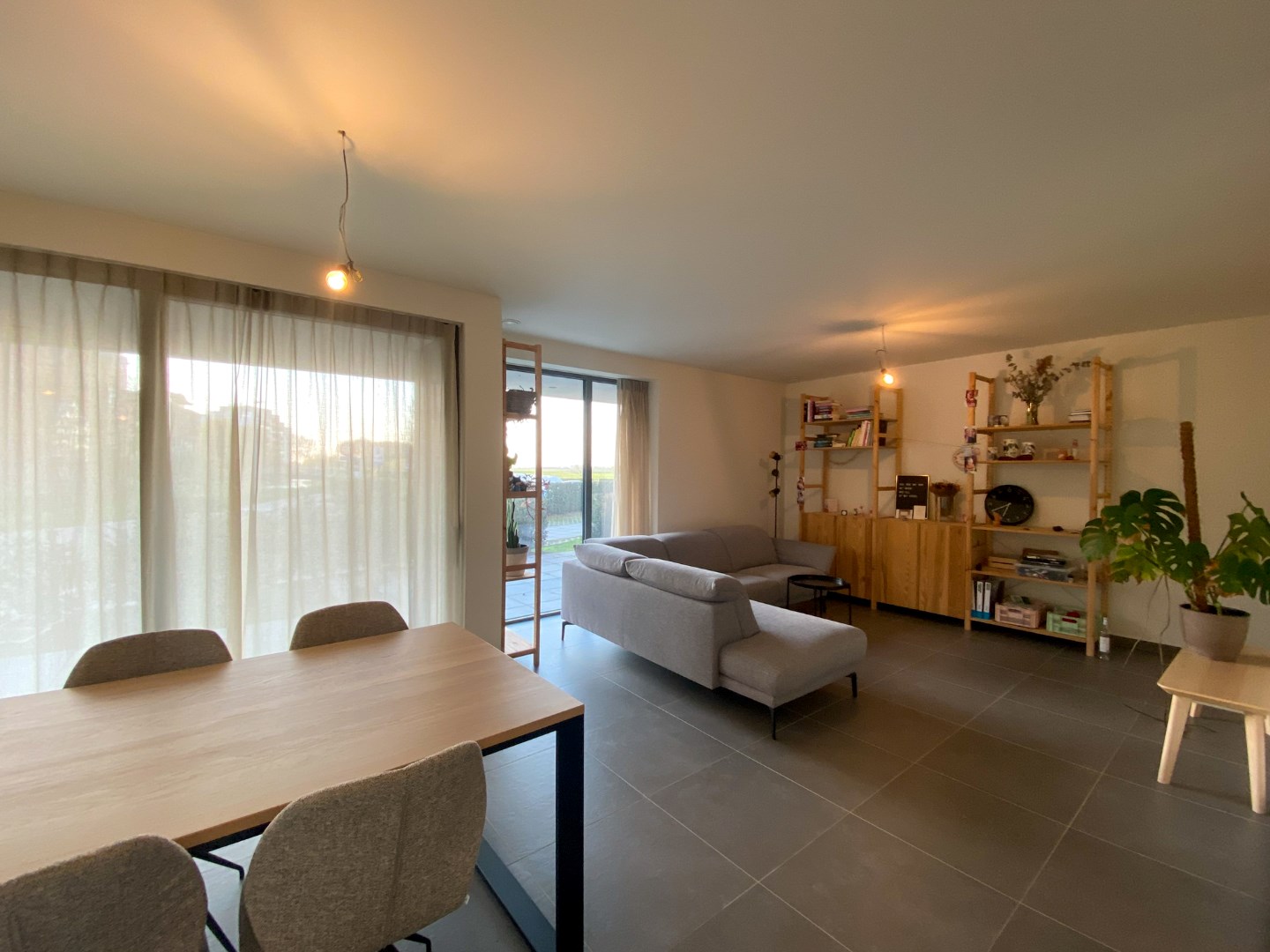 Gemeenschappelijke inkomhal - inkomhal appartement - ingerichte badkamer met inloopdouche, toilet en wastafel - slaapkamer - lichtrijke leefruimte met open ingerichte keuken en eiland, bevat o.a. spoelbak, inductie kookplaat, dampkap, koelkast, diepvries, vaatwas, oven en combi-oven - berging - aangename tuin (30m²) met ruim terras.