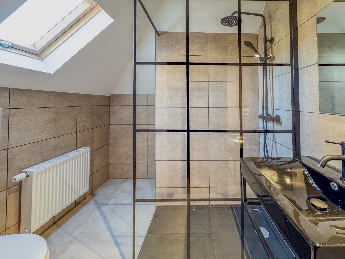 Ingerichte badkamer met instapdouche en lavabo - slaapkamer 1 - slaapkamer 2/bureau.