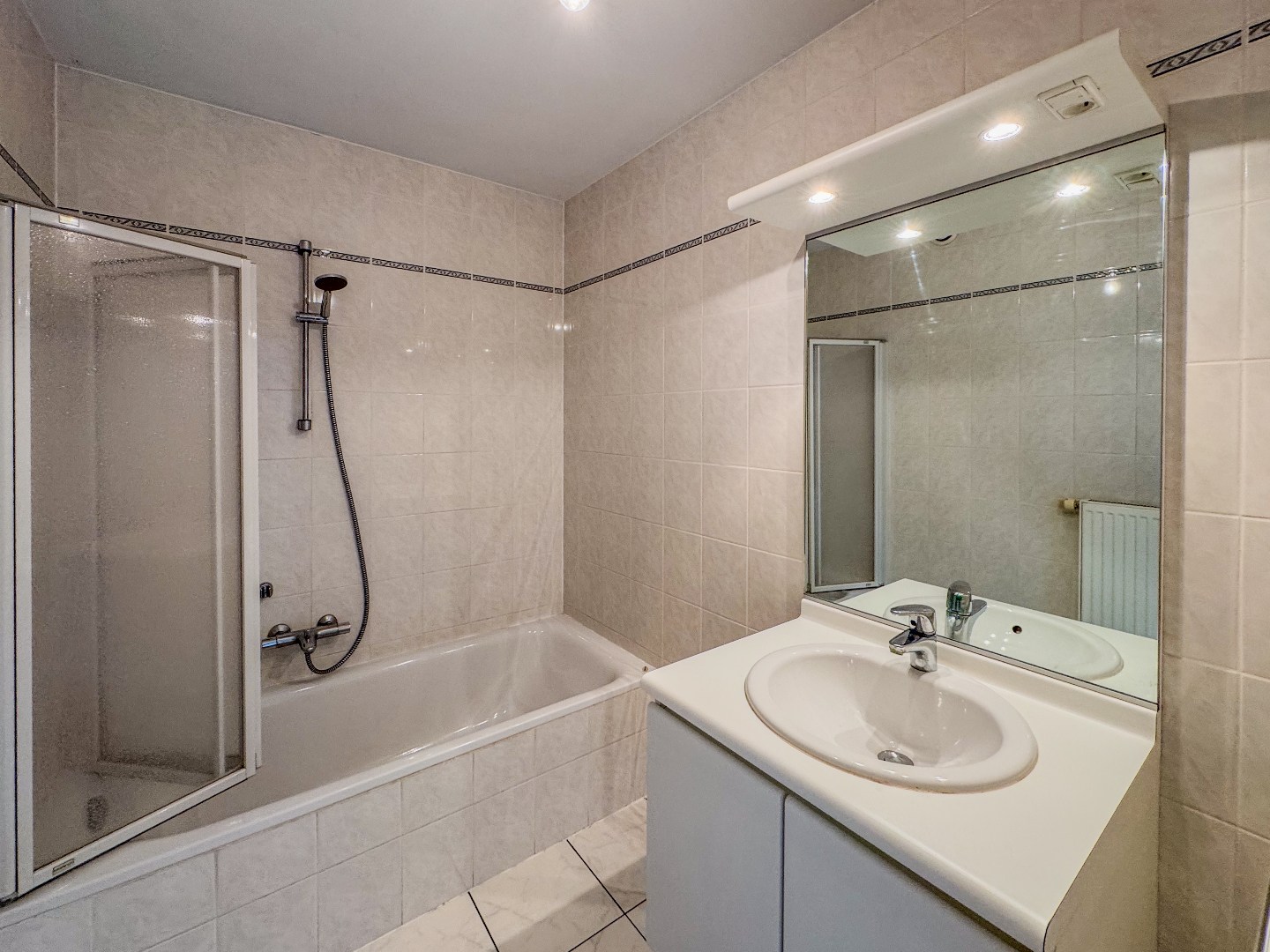 VERDIEP 1: Inkomhal - berging - apart toilet - ruime en lichtrijke woonkamer met open ingerichte keuken met elektrische kookplaat, dampkam, spoelbak, oven en koelkast - aangenaam en ruim terras - ingerichte badkamer lavabomeubel en ligbad/douche - slaapkamer 1 - slaapkamer 2 - wasruimte.