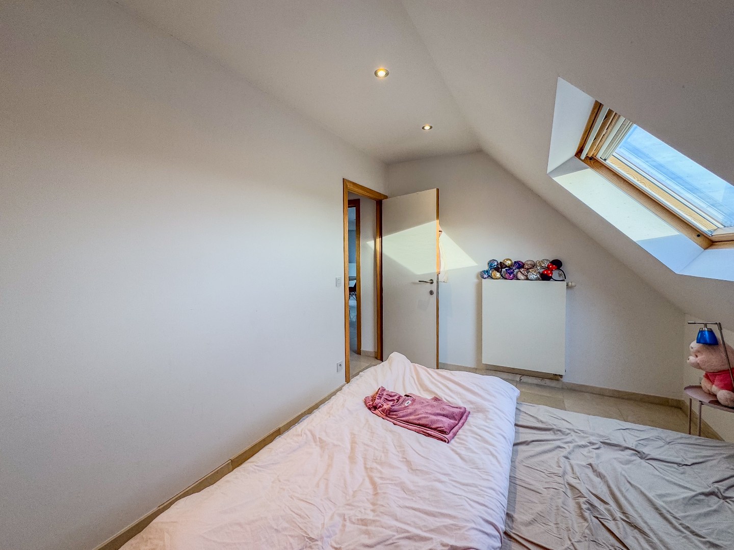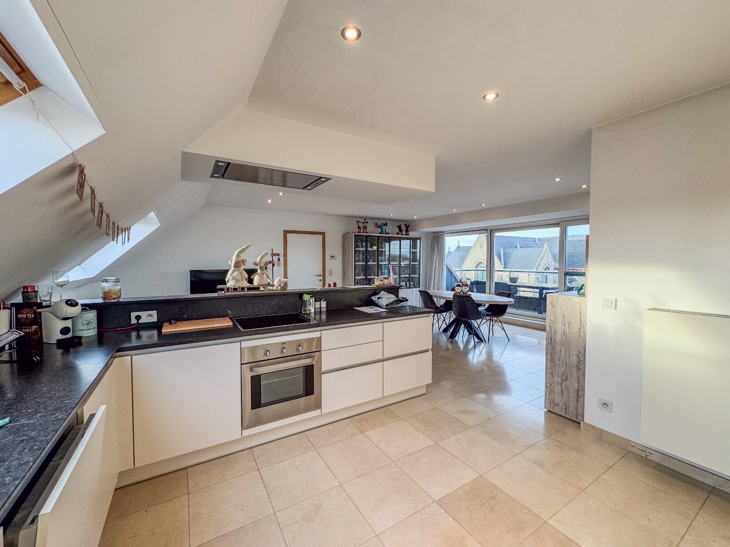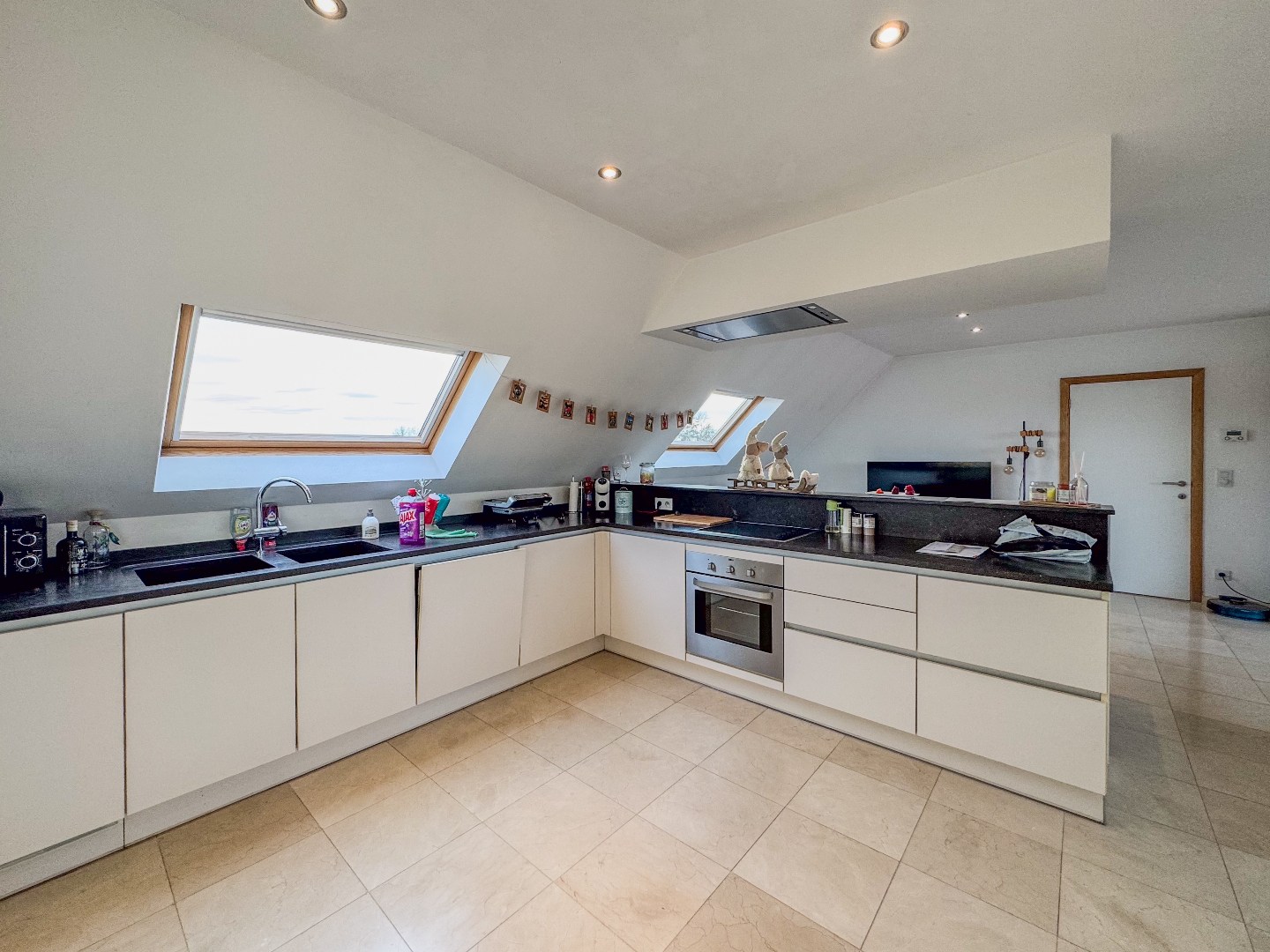 Inkomhal met apart gastentoilet - leefruimte met toegang tot het terras - open ingerichte keuken met marmeren werkblad en bevat o.a. een oven, vitrokeramische kookplaat, dampkap met afstandsbediening, vaatwasmachine, koelkast en ingemaakte kasten - bergruimte met wasmachine en droogkast (voorzien door de verhuurder) - slaapkamer 1 - ingerichte badkamer met relaxatiebad, instapdouche en dubbele wastafel - slaapkamer 2 - ruime geïsoleerde zolder.