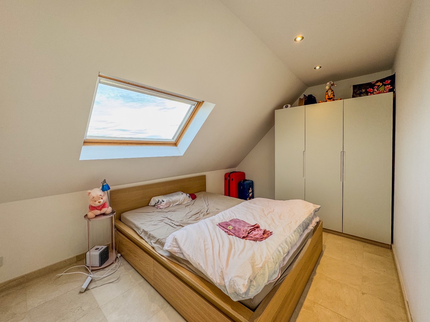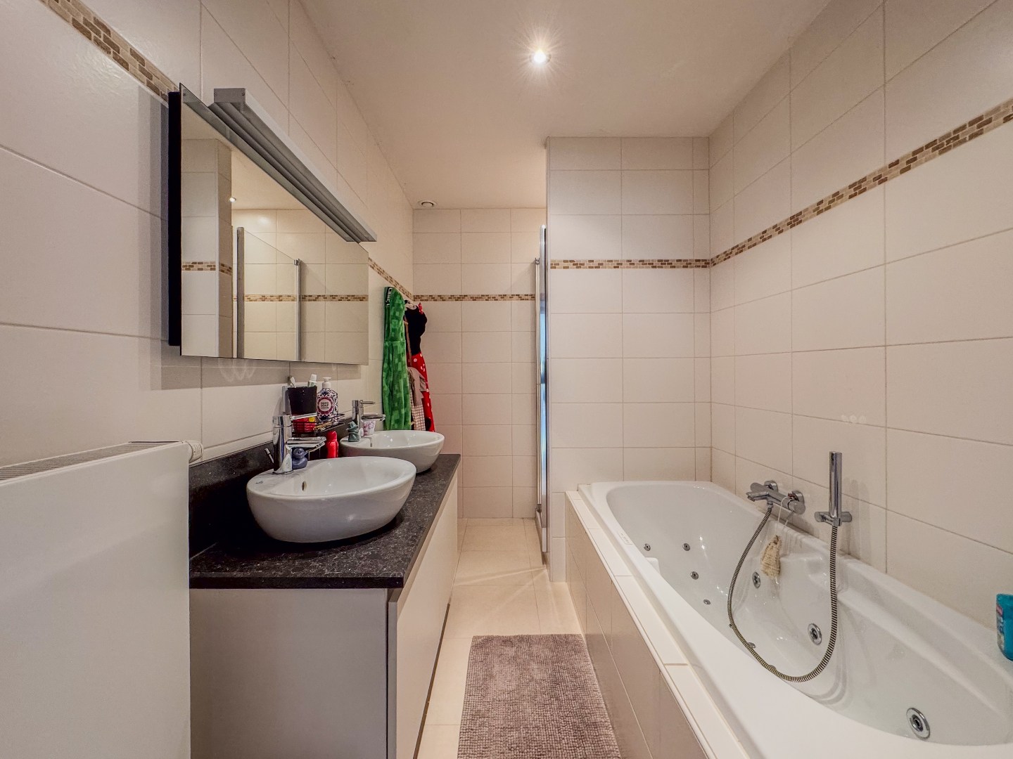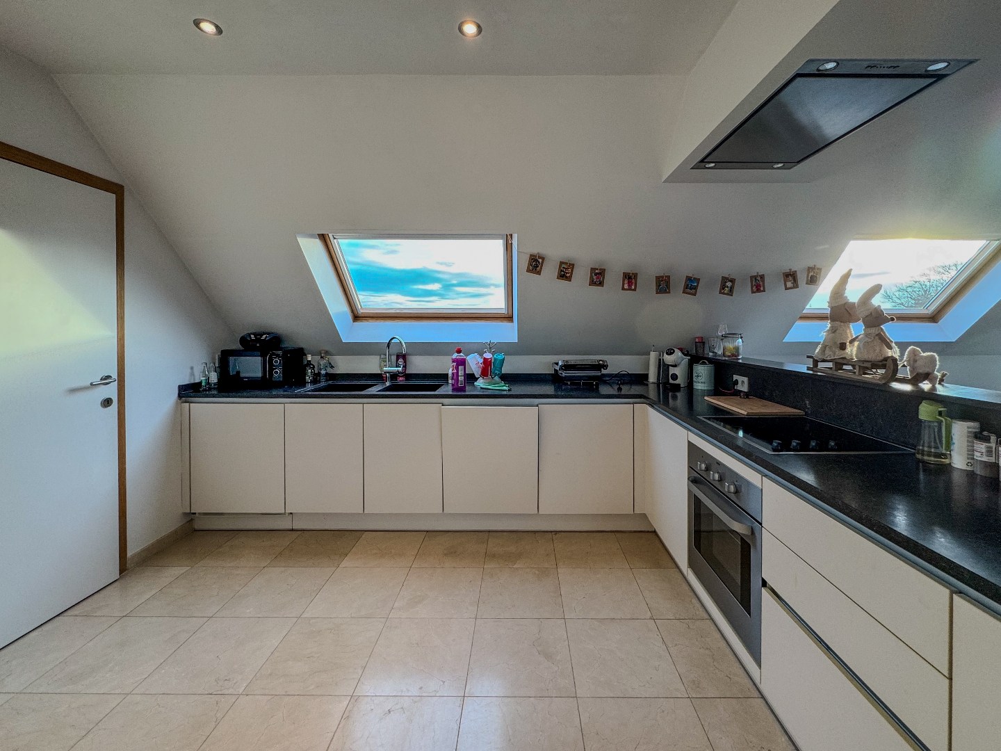 Inkomhal met apart gastentoilet - leefruimte met toegang tot het terras - open ingerichte keuken met marmeren werkblad en bevat o.a. een oven, vitrokeramische kookplaat, dampkap met afstandsbediening, vaatwasmachine, koelkast en ingemaakte kasten - bergruimte met wasmachine en droogkast (voorzien door de verhuurder) - slaapkamer 1 - ingerichte badkamer met relaxatiebad, instapdouche en dubbele wastafel - slaapkamer 2 - ruime geïsoleerde zolder.