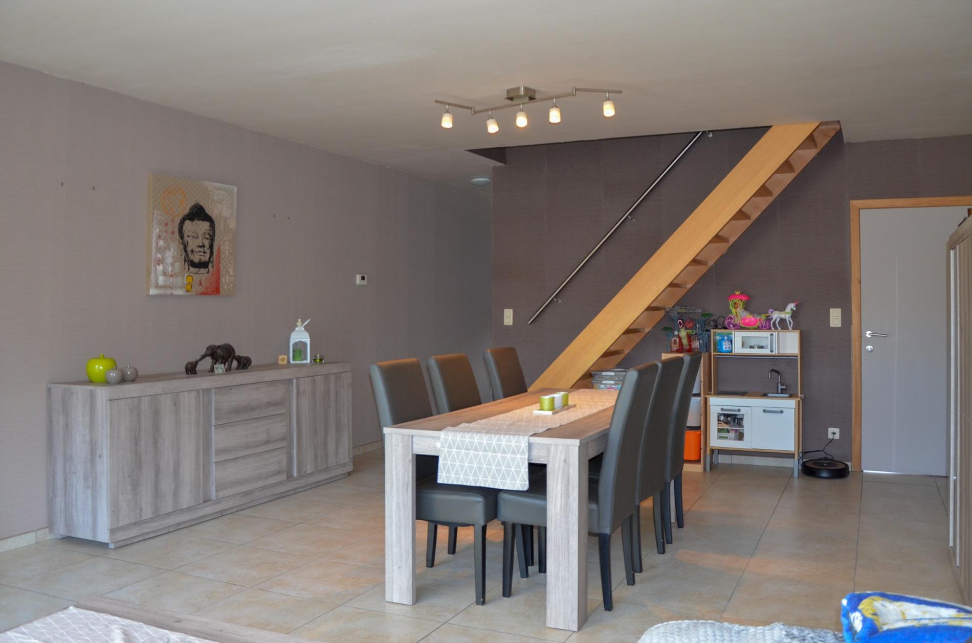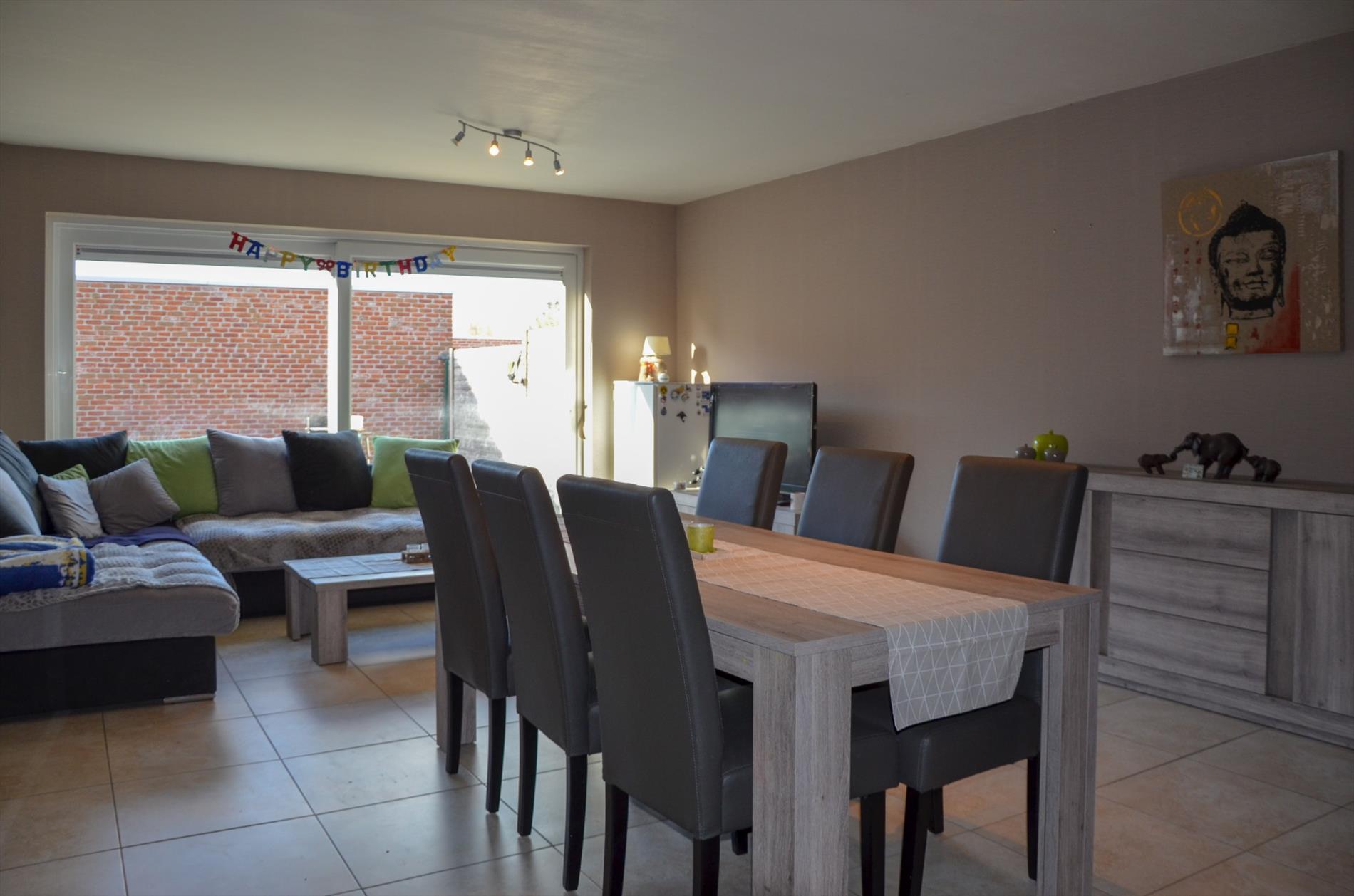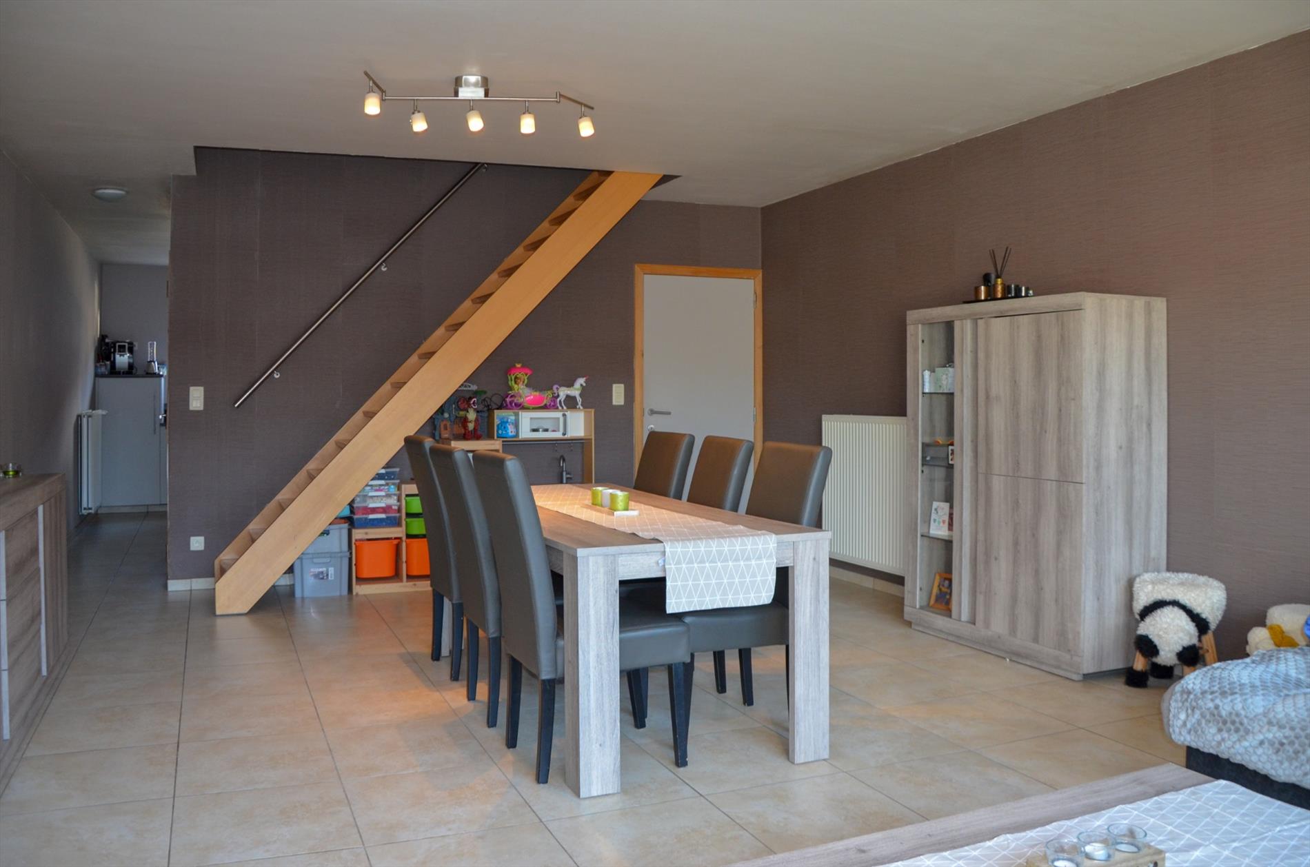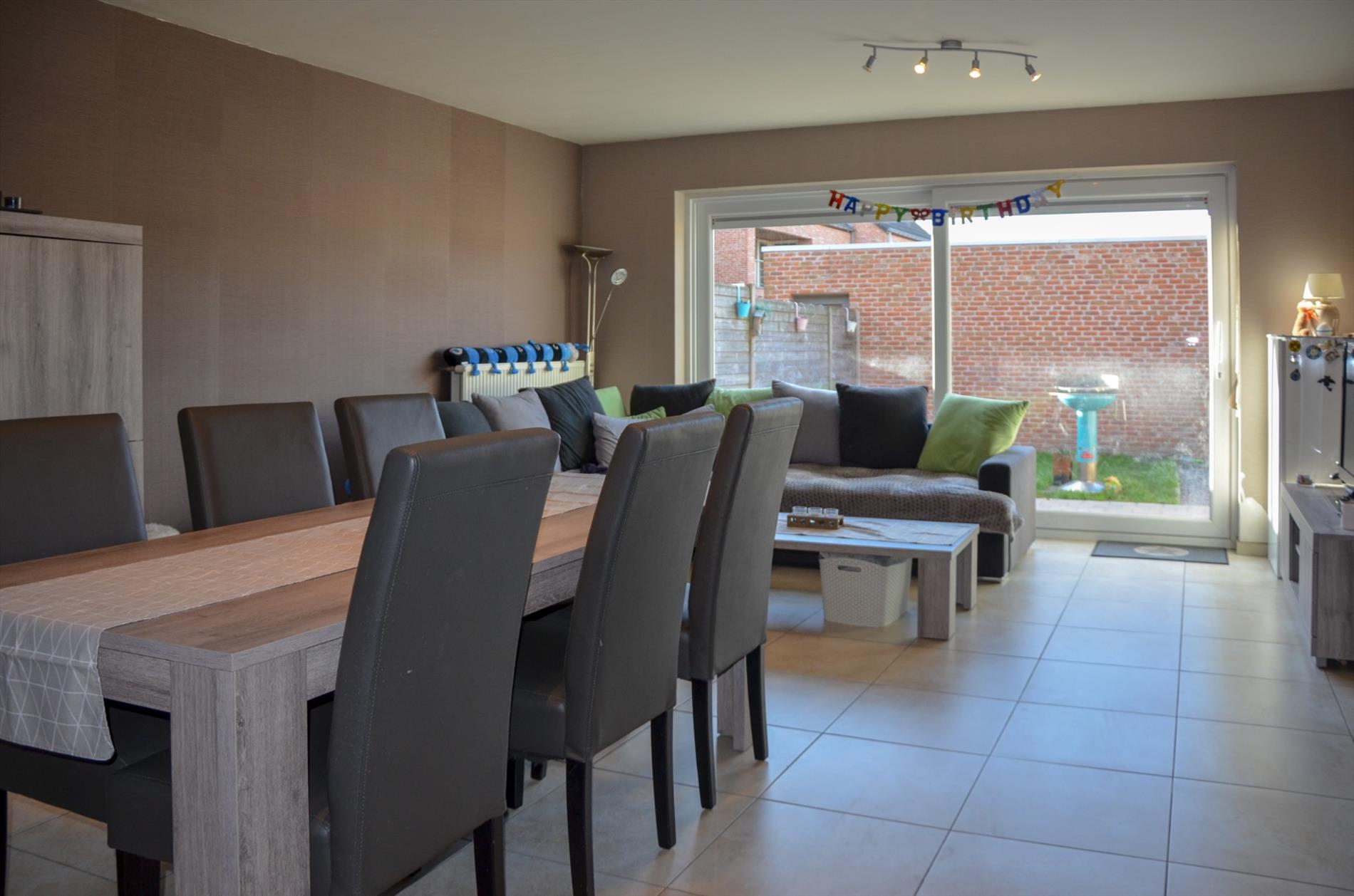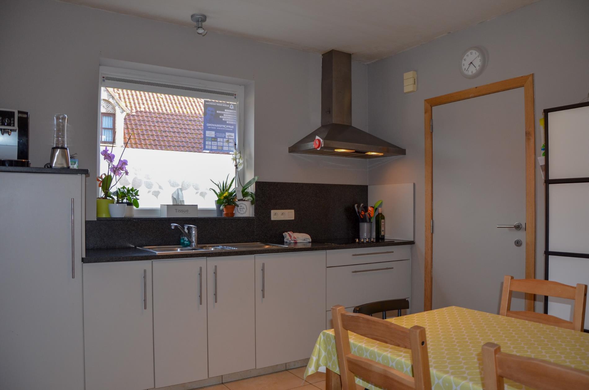 Inkom - apart gastentoilet - lichtrijke living - ingerichte keuken voorzien van elektrische kookplaat, dampkap, koelkast en spoelbak - berging - terras & tuintje - garage met sectionaalpoort met inrit via de Maagdhoek.