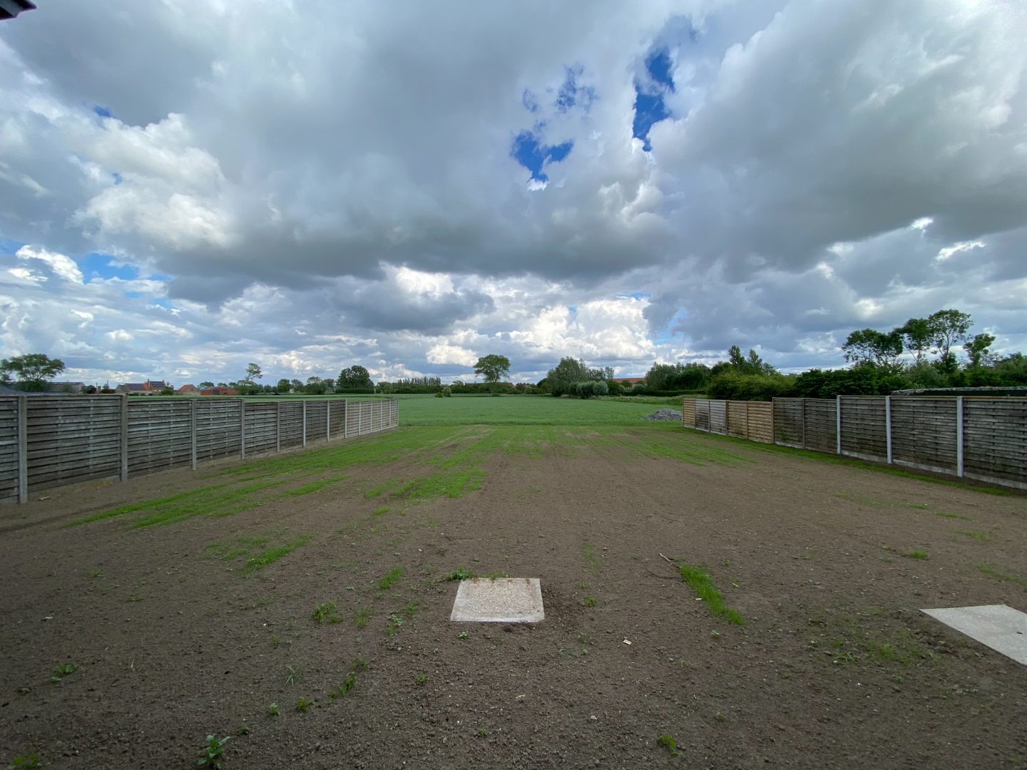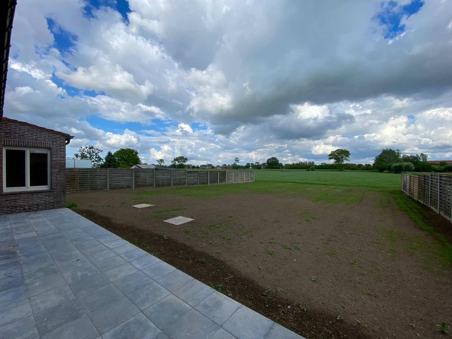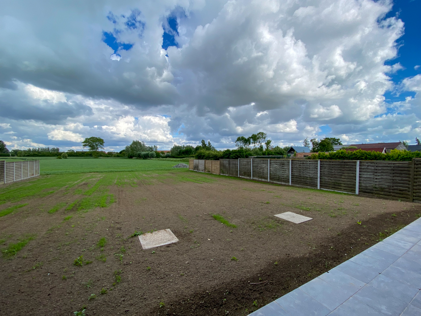 Volledig aangelegde tuin met oprit, terras en gazon met zicht op de achterliggende velden.