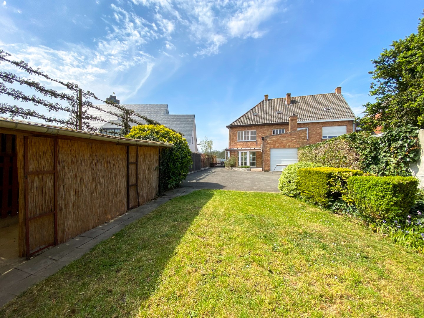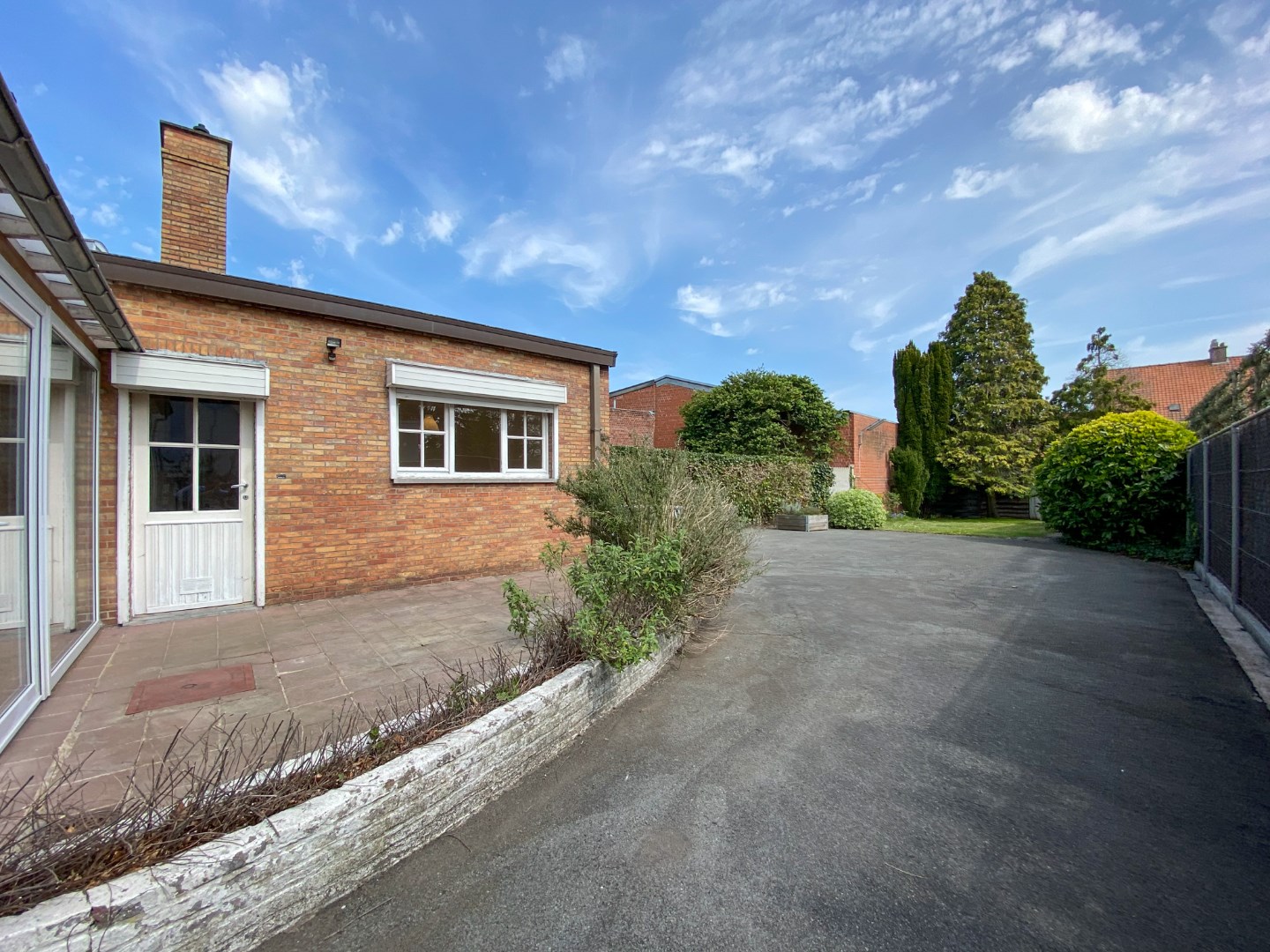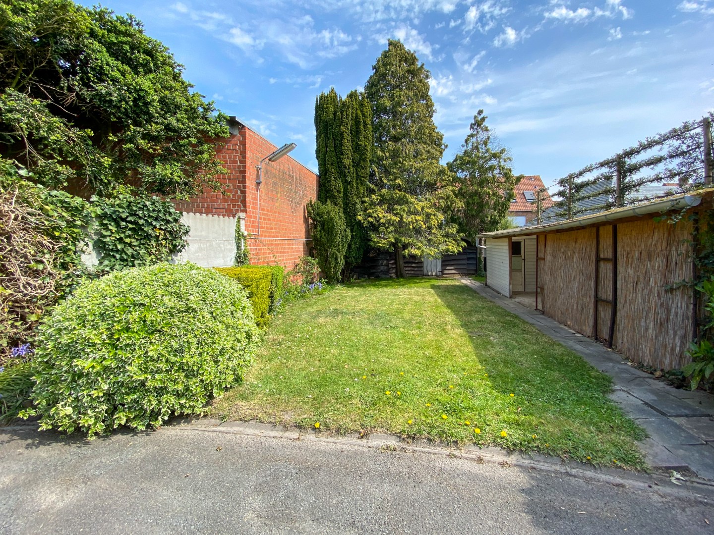 Volledig omheinde tuin met ruime oprit, terras en tuinberging.