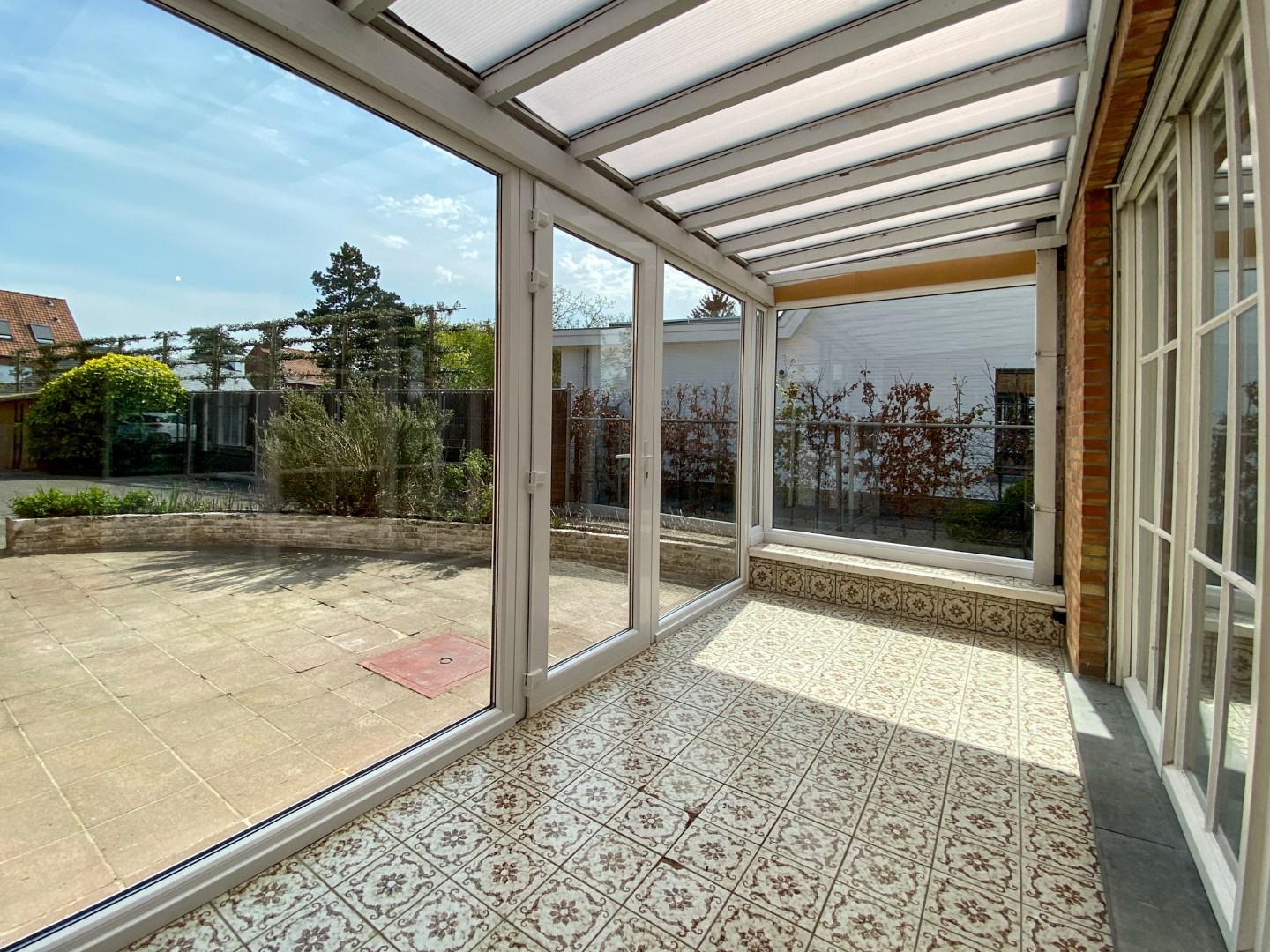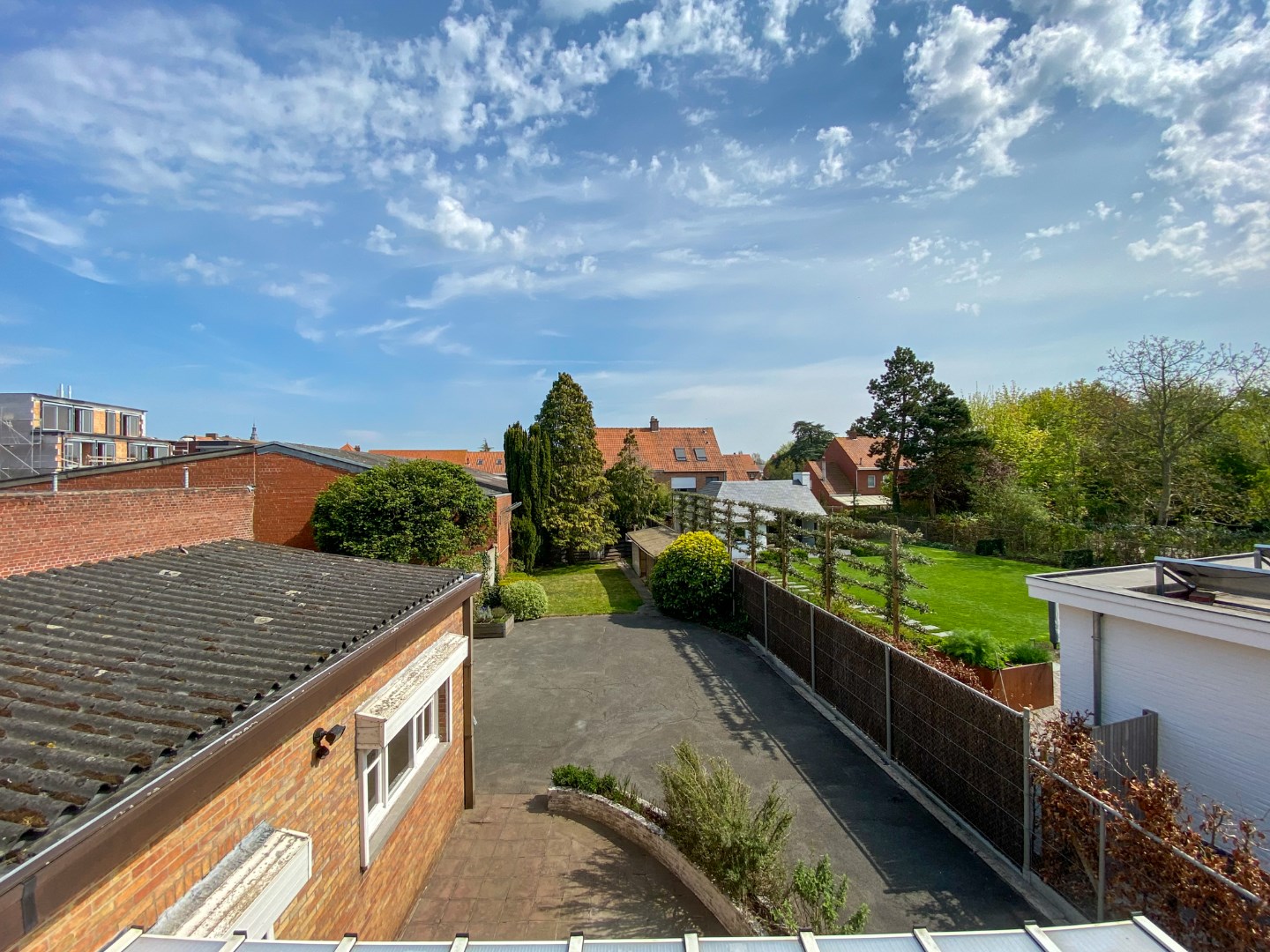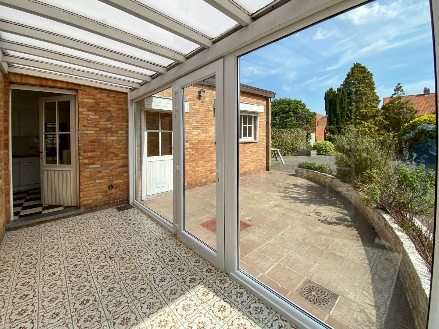 Volledig omheinde tuin met ruime oprit, terras en tuinberging.