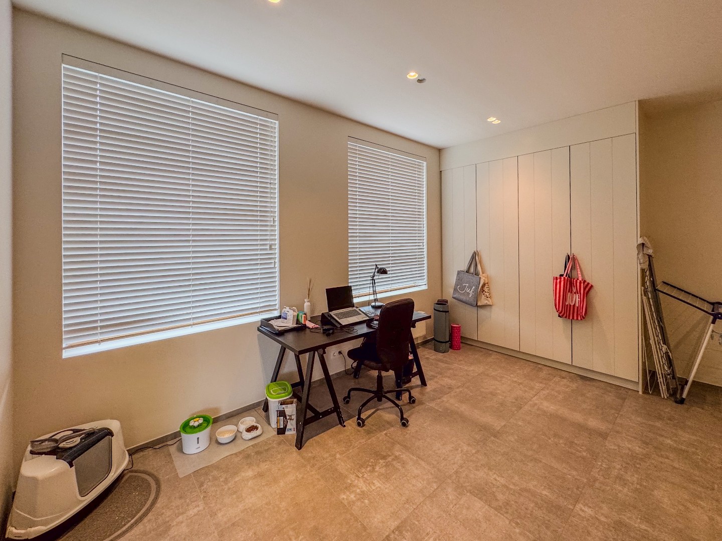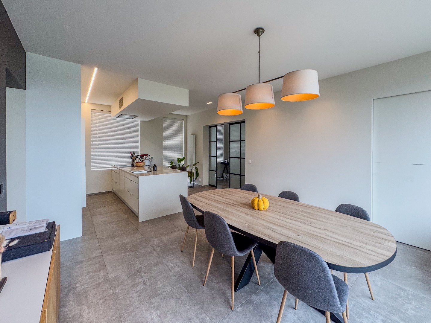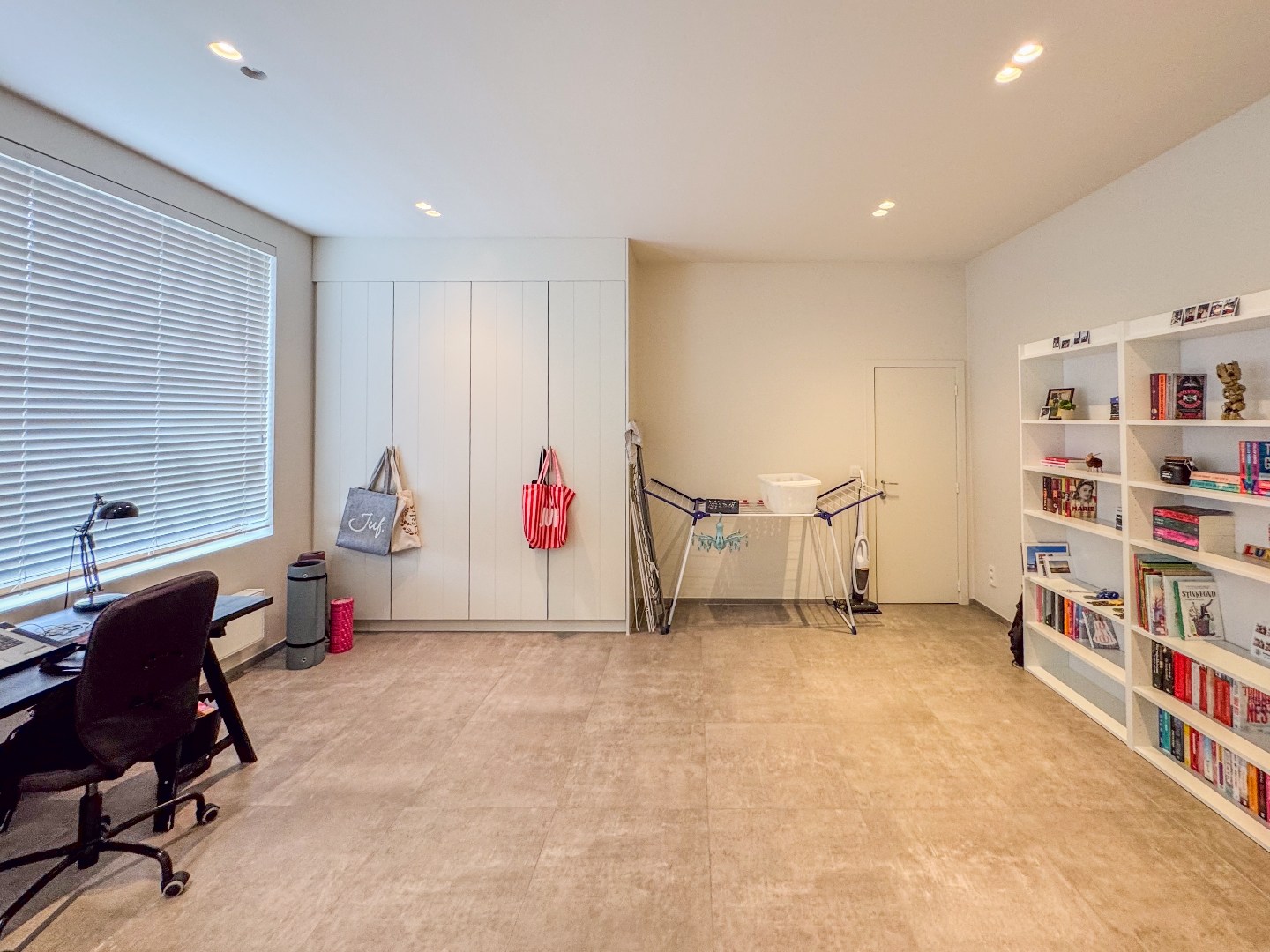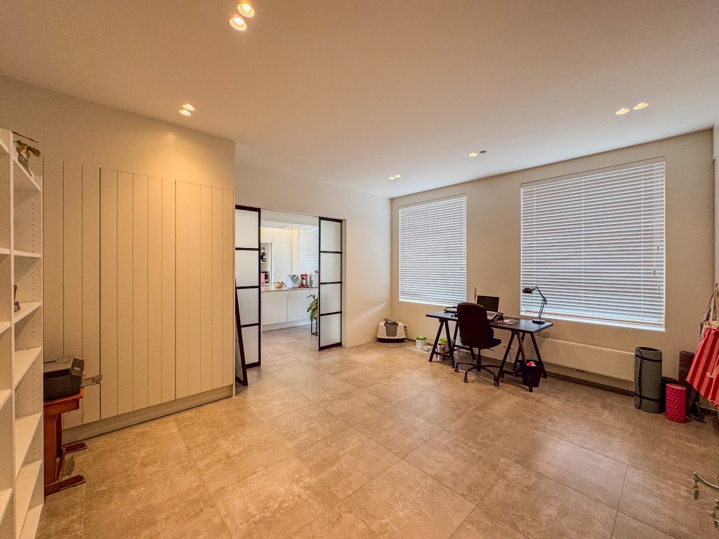 Inkomhal - appart toilet - leefruimte - eetplaats met open en volledig ingerichte keuken - ruime bureau - tal van bergruimte - kelder.