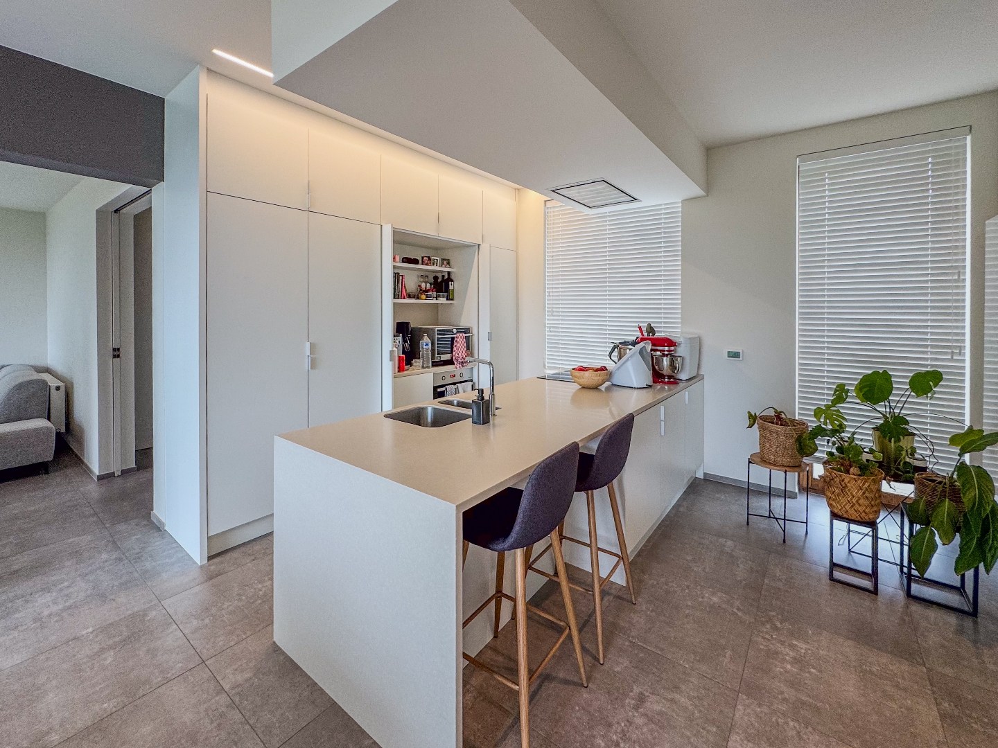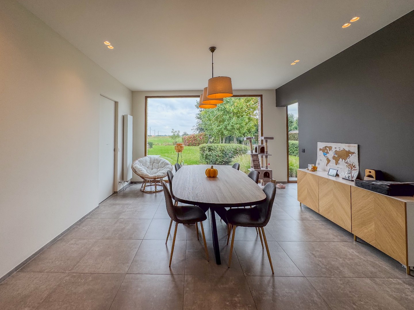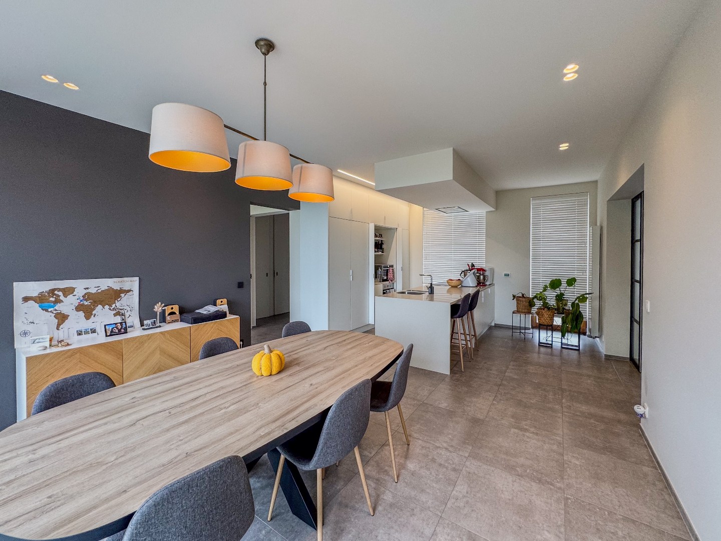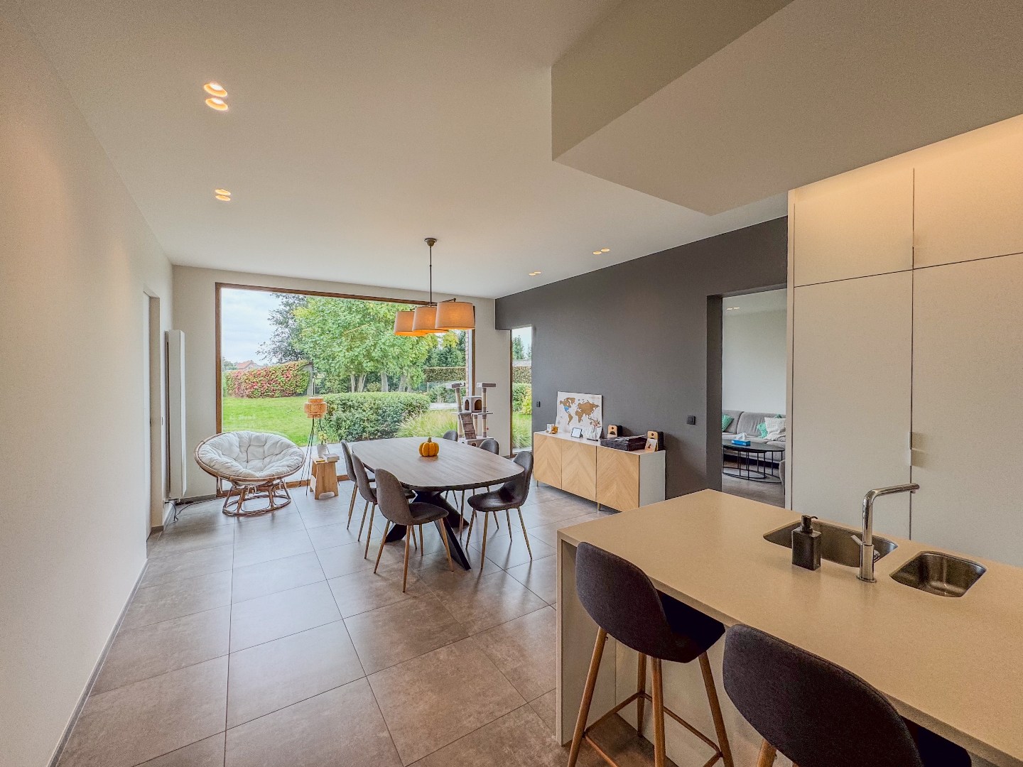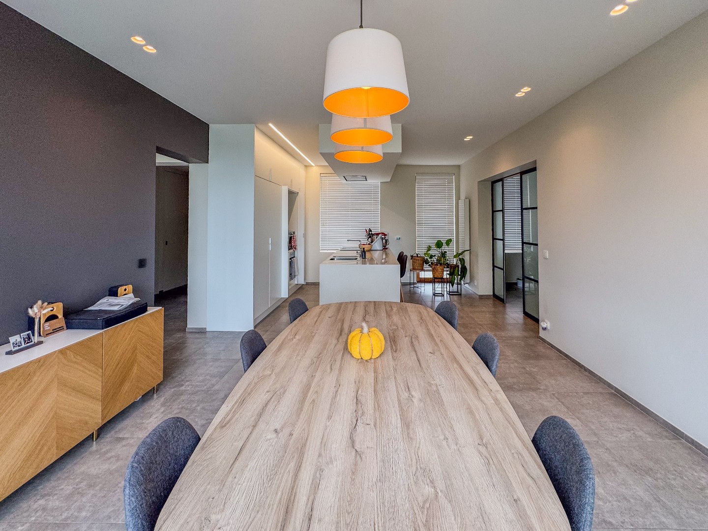 Inkomhal - appart toilet - leefruimte - eetplaats met open en volledig ingerichte keuken - ruime bureau - tal van bergruimte - kelder.
