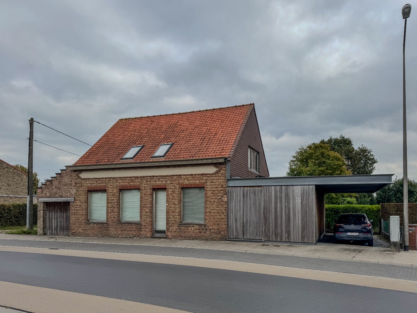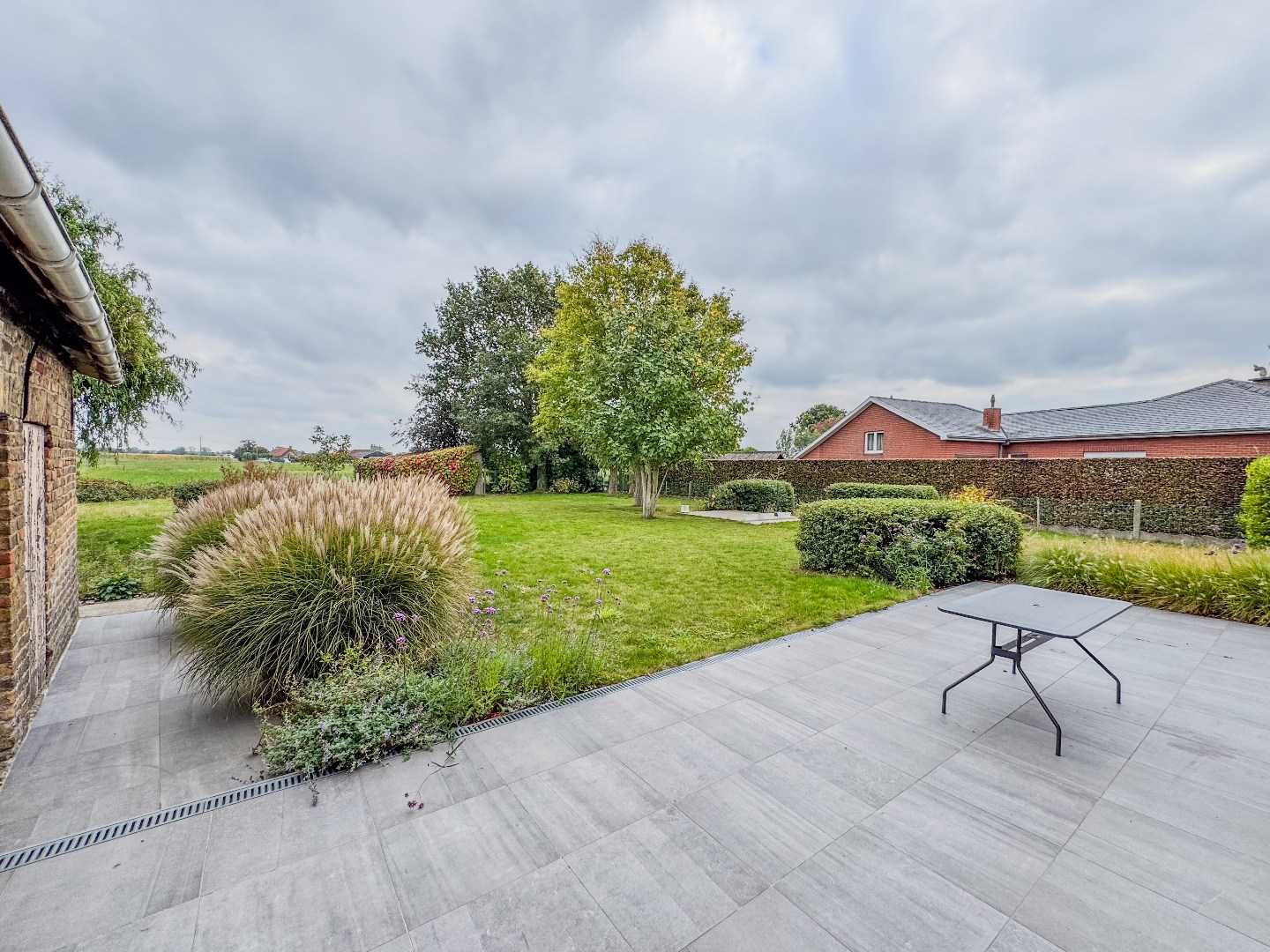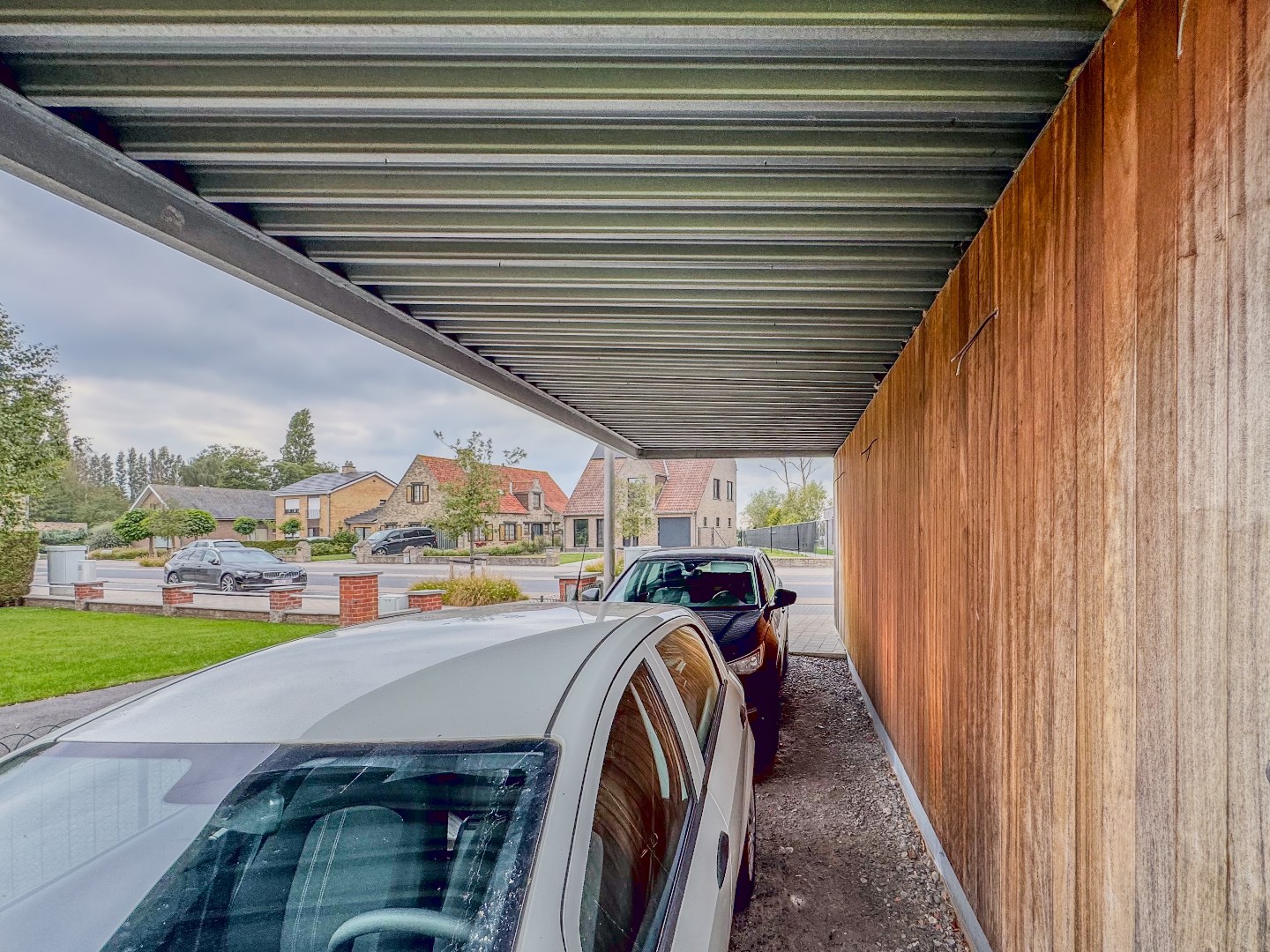 Volledig aangelegde tuin met aangenaam terras en dubbele carport.
