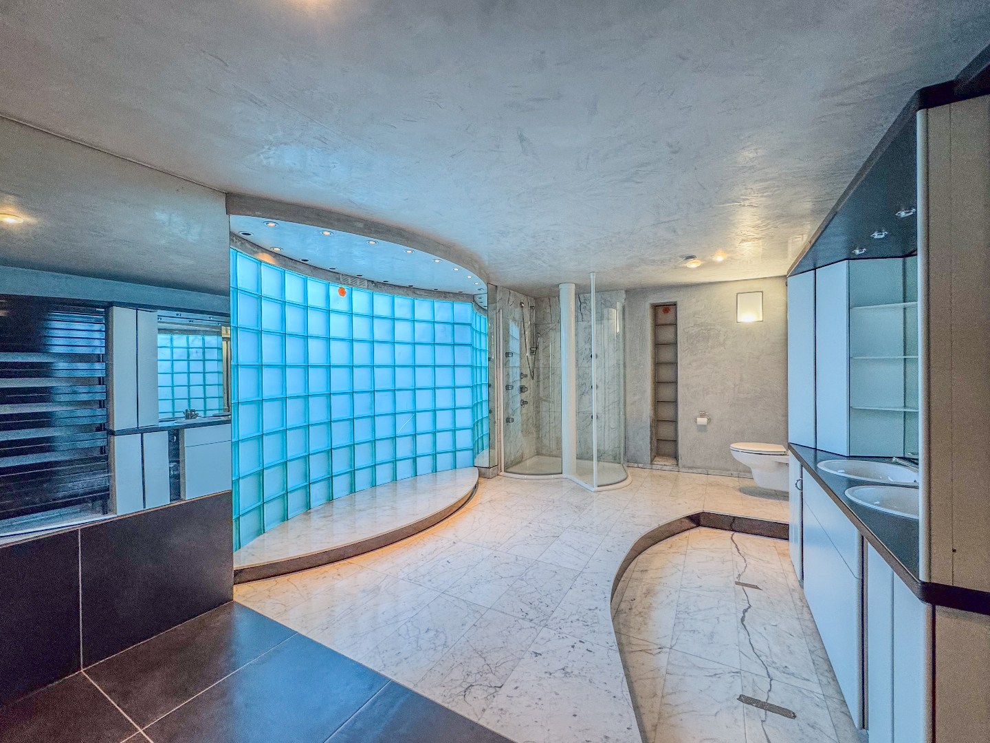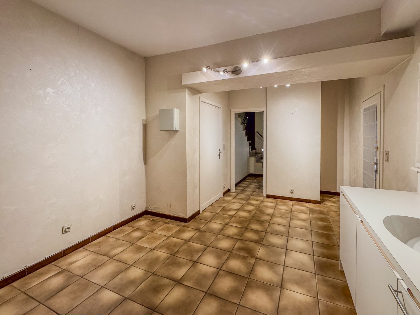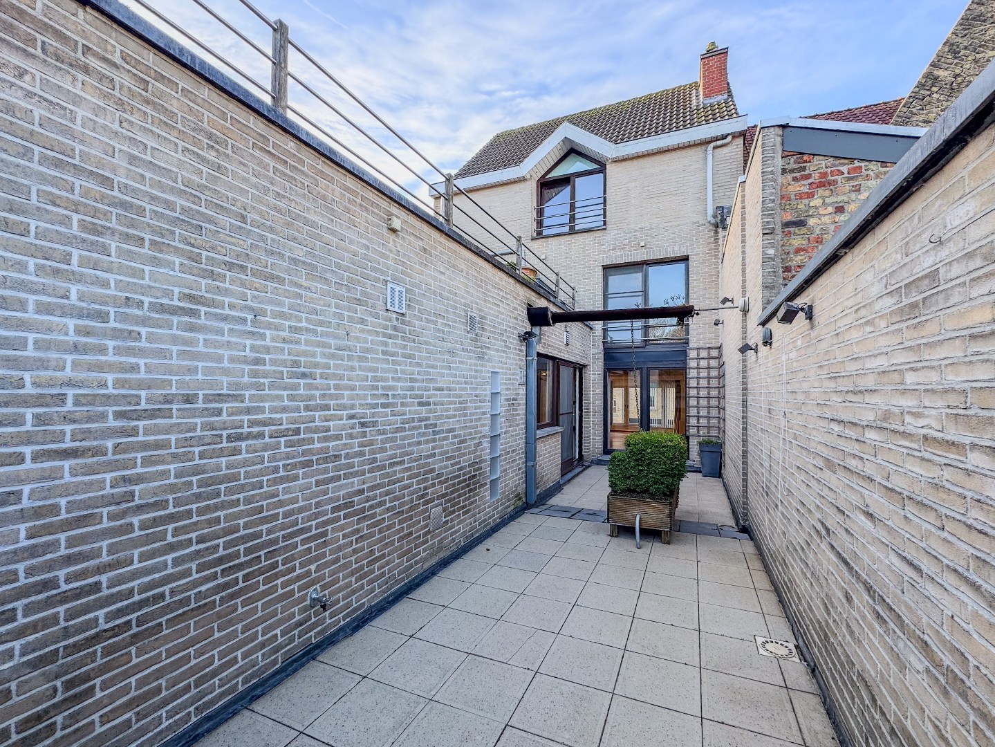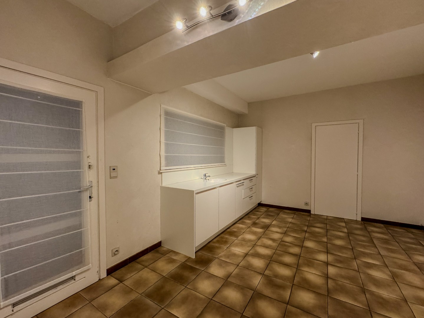 Bureau/werkruimte – apart toilet – ruime polyvalente ruimte met watervoorziening – inpandige garage – aanpalende ruime bergruimte.