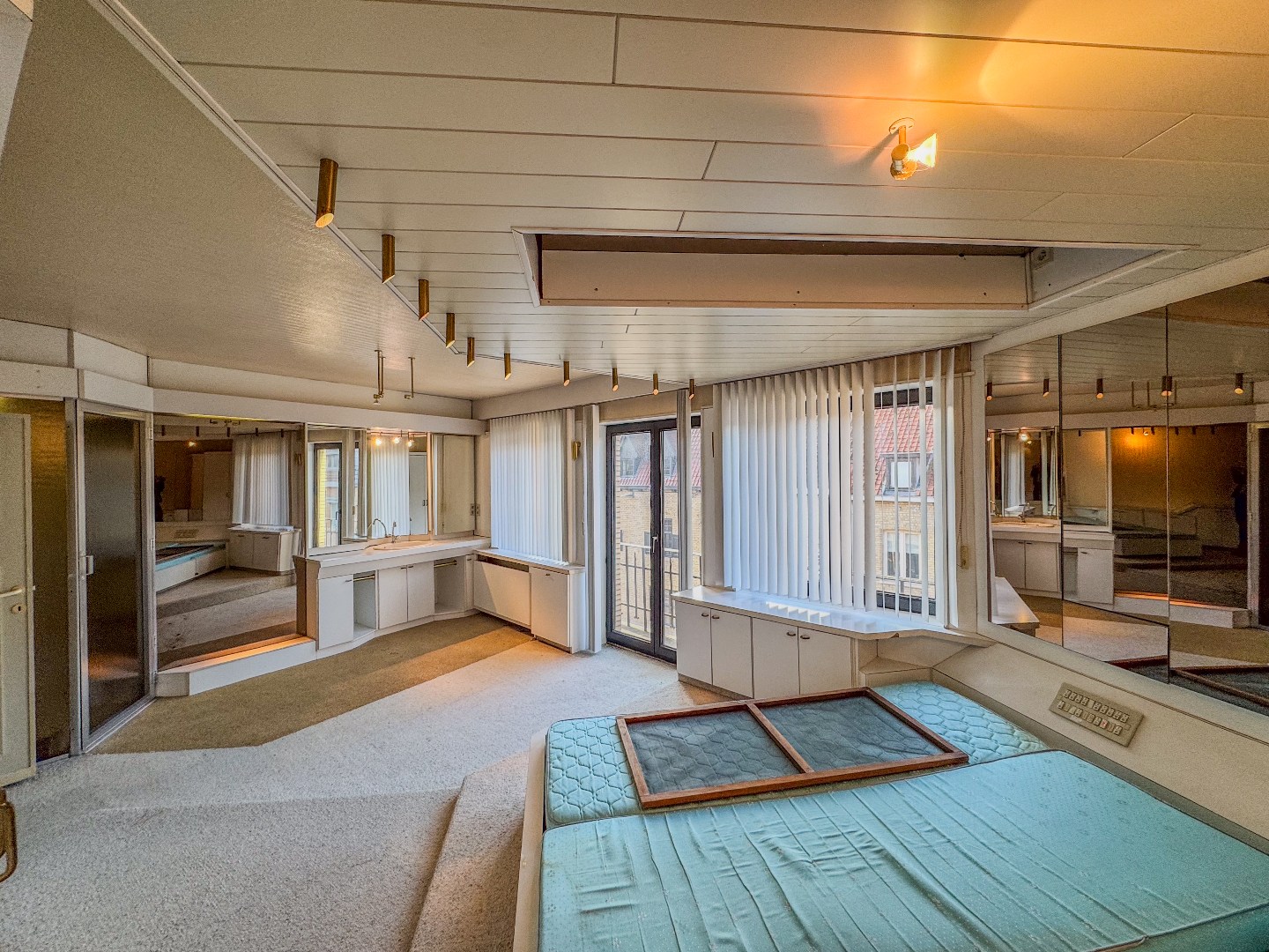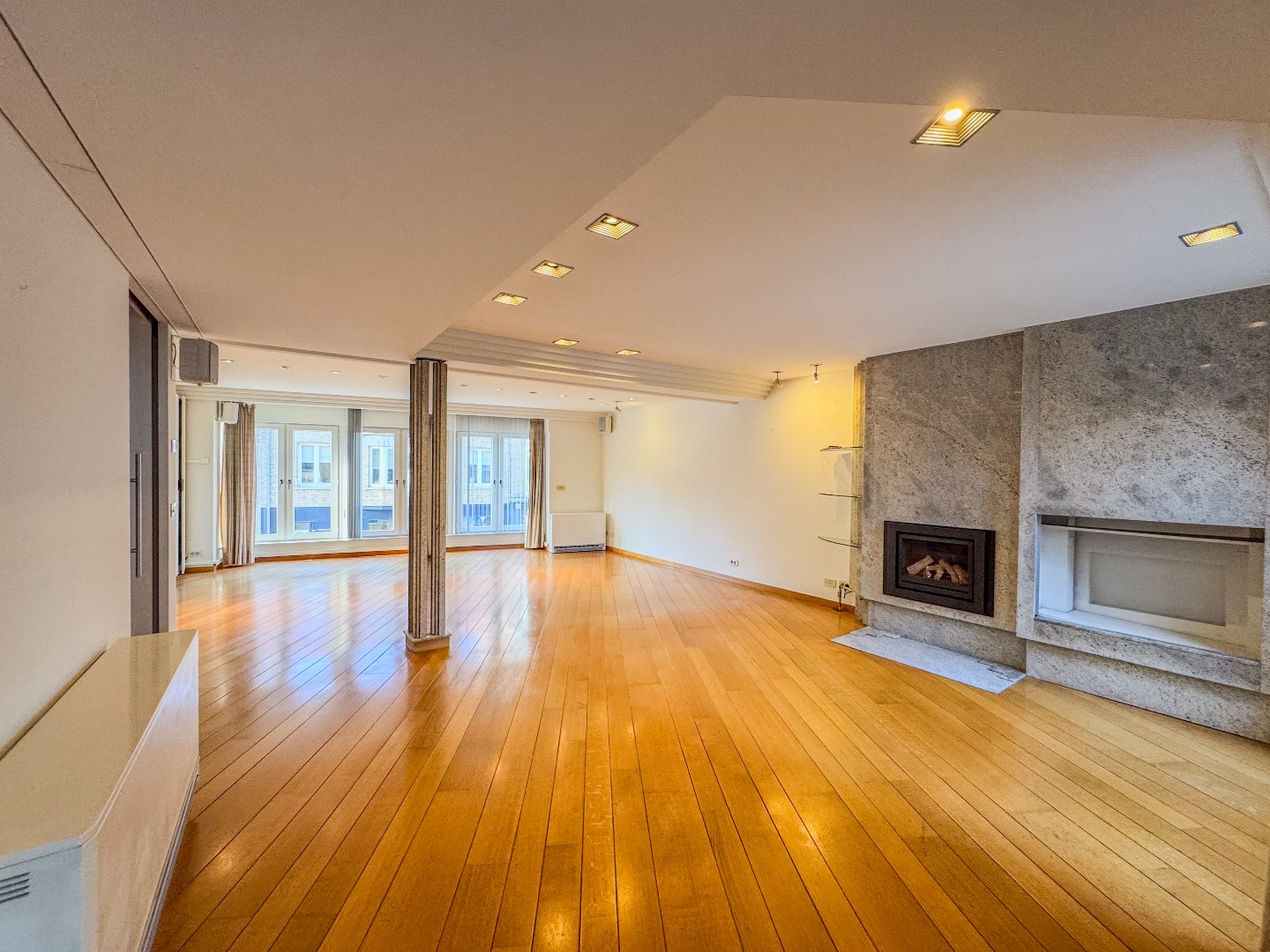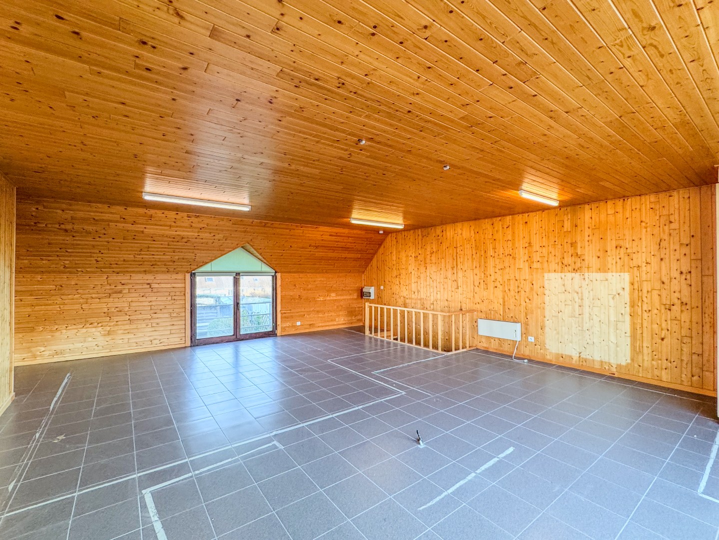 Ruime polyvalente ruimte met toegang tot het dakterras met uitzicht op de kerk en de markt.