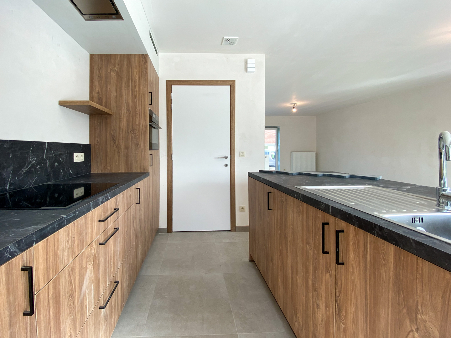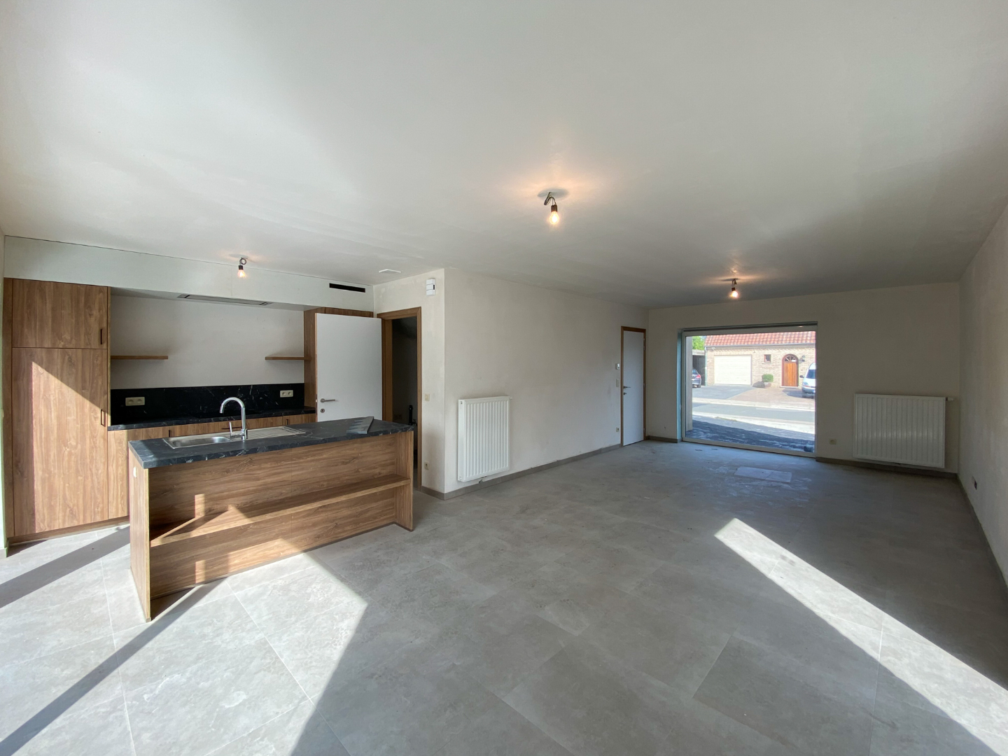 Inkom - apart toilet – leefruimte met open ingerichte keuken – berging.