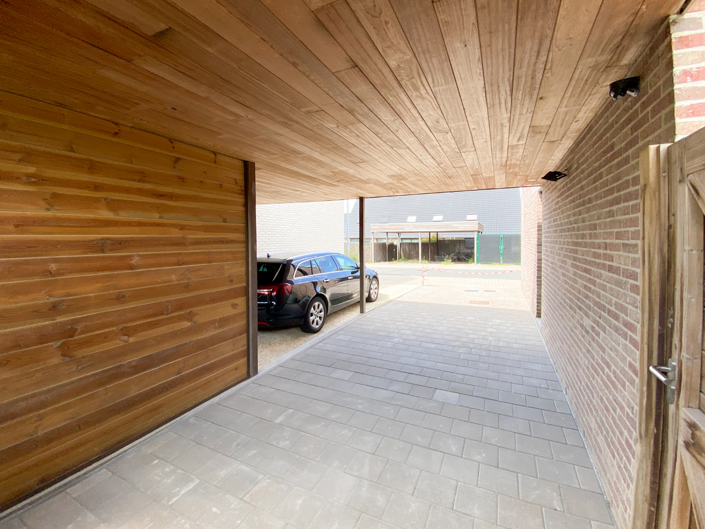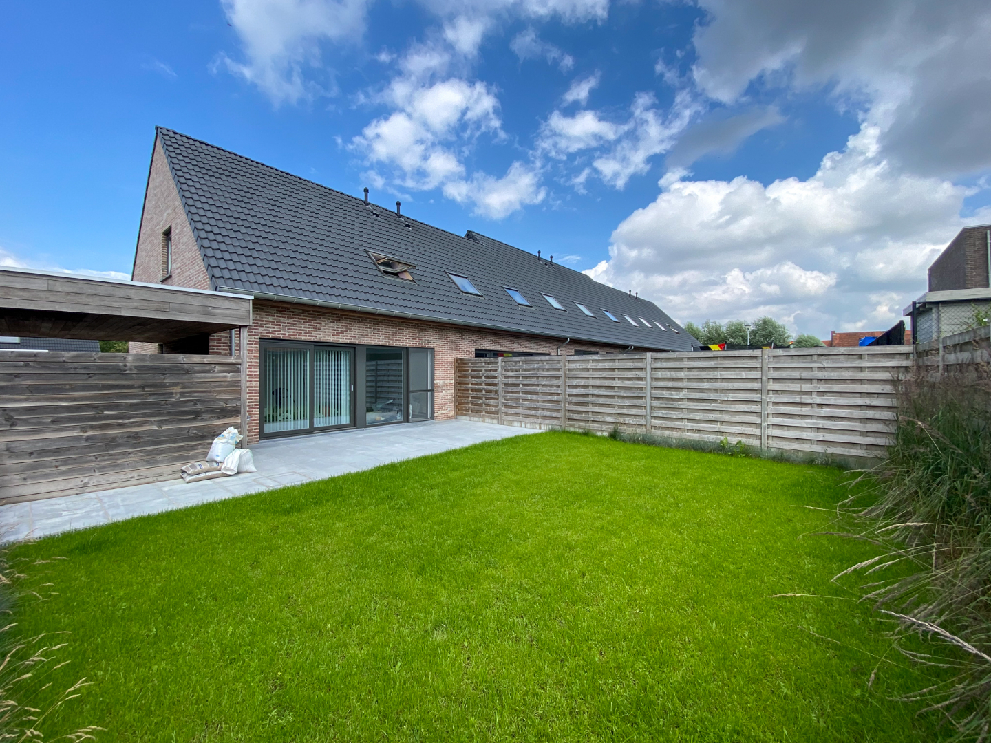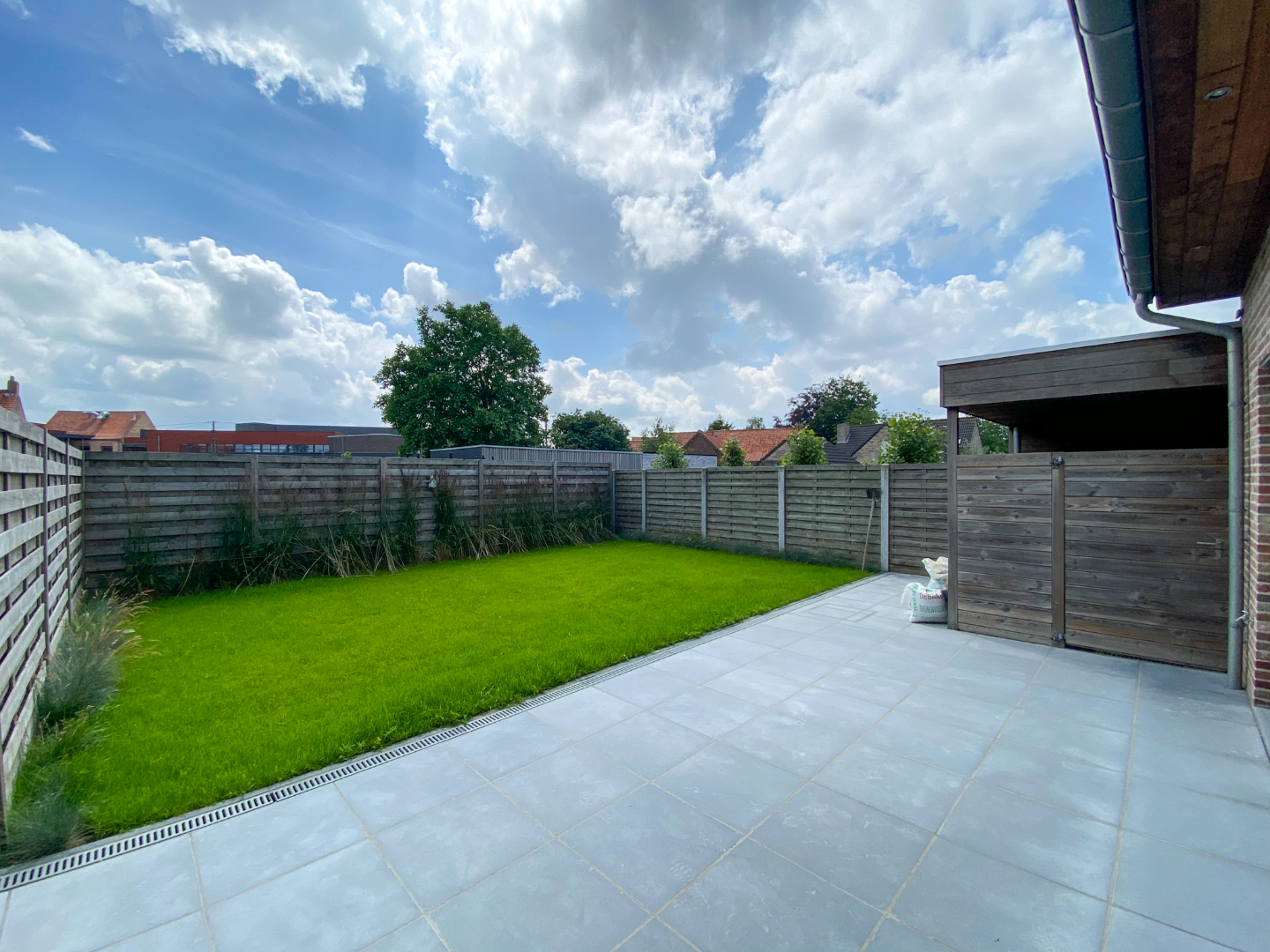 Volledig aangelegde tuin met ruime carport, terras en gazon.