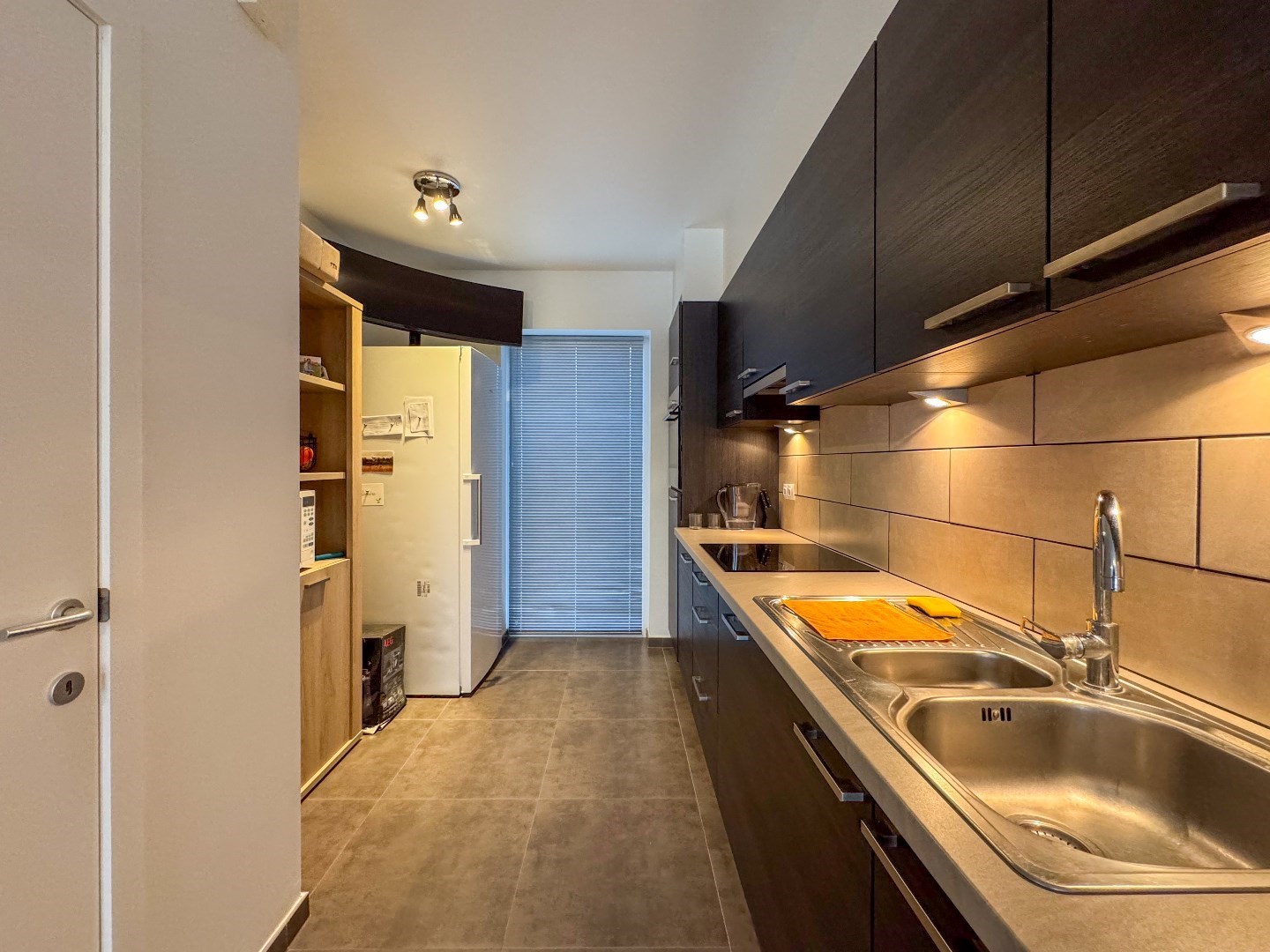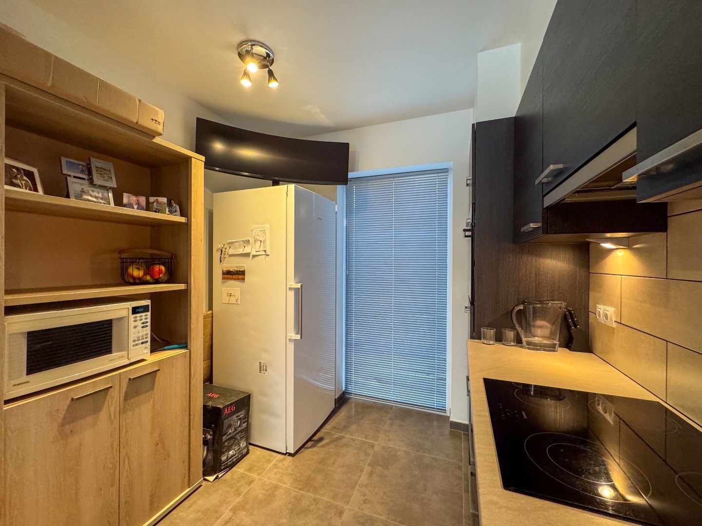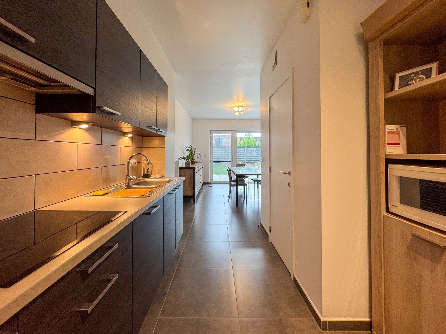 Inkomhal - apart toilet - berging - leefruimte - open ingerichte keuken met o.a. een vaatwas, elektrische kookplaat, dampkap, koelkast en combi oven - berging.