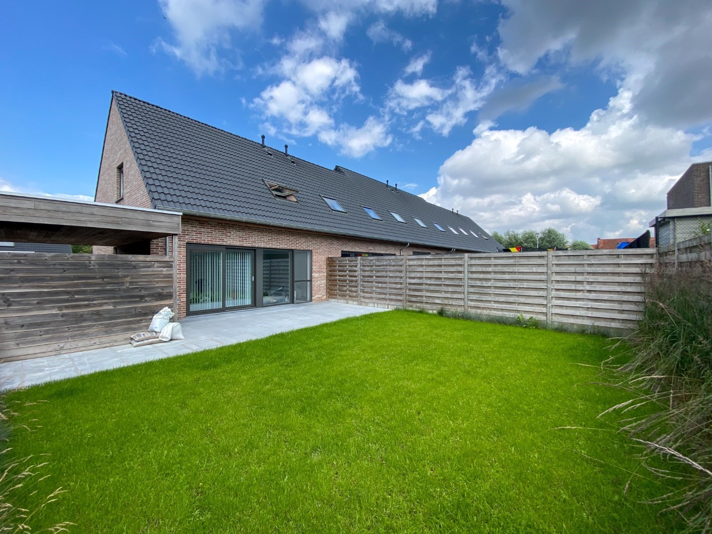 Volledig aangelegde tuin met ruime carport, terras en gazon.