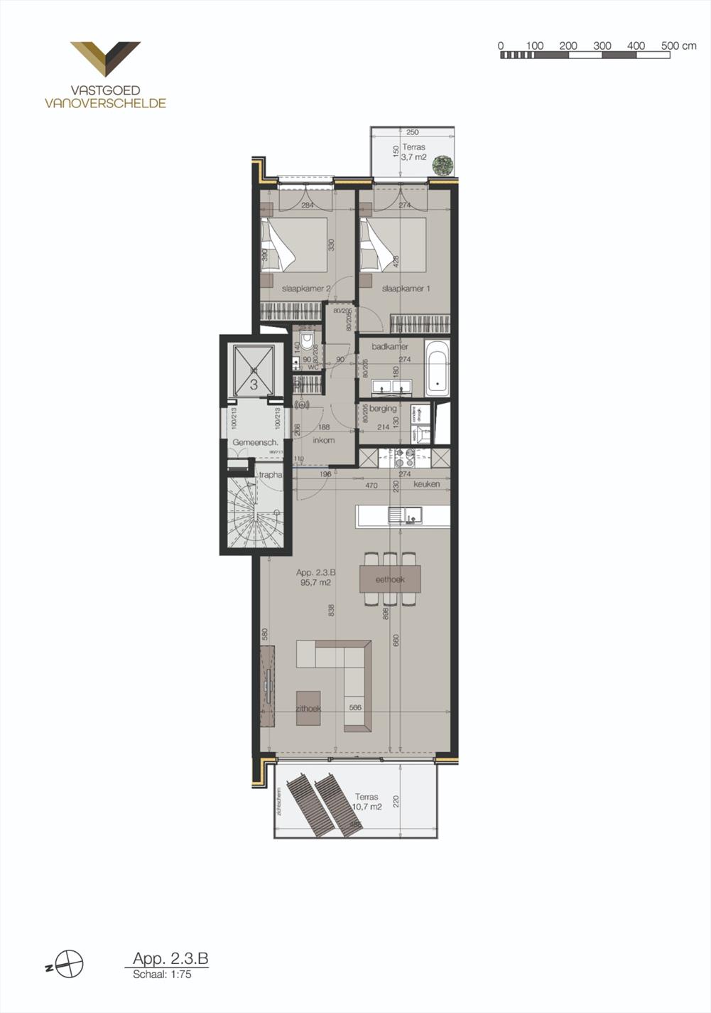 Gemeenschappelijke inkomhal - inkomhal appartement met vestiaireruimte - apart toilet - 2 slaapkamers (12m² en 11m²) - ingerichte badkamer (5m²) - praktische berging (3m²) - lichtrijke leefruimte (46m²) met open ingerichte keuken - 2 grote terrassen (10,7m² en 3,7m²).