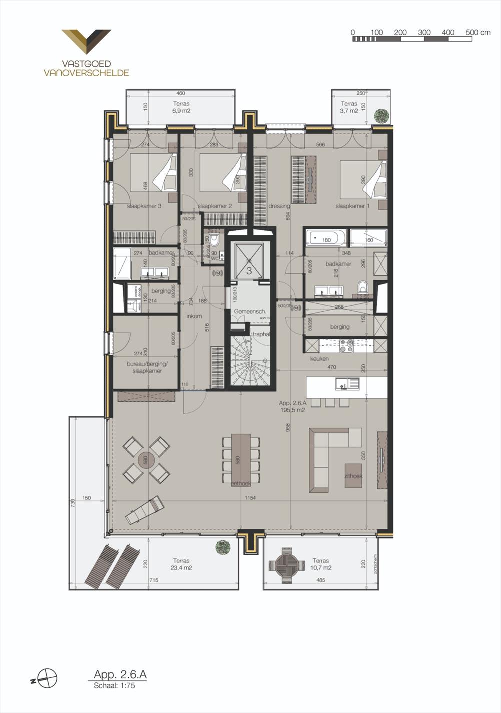 Gemeenschappelijke inkomhal - inkomhal appartement met vestiaireruimte - apart toilet - 3 slaapkamers (22m², 13m² en 11m²) - 2 ingerichte badkamers (10,5m² + 4m²) - 3 praktische bergingen (16,5m²) - lichtrijke leefruimte (55,5m²) met open ingerichte keuken - 4 grote terrassen (23,4m², 10,7m², 6,9m² en 3,7m²).