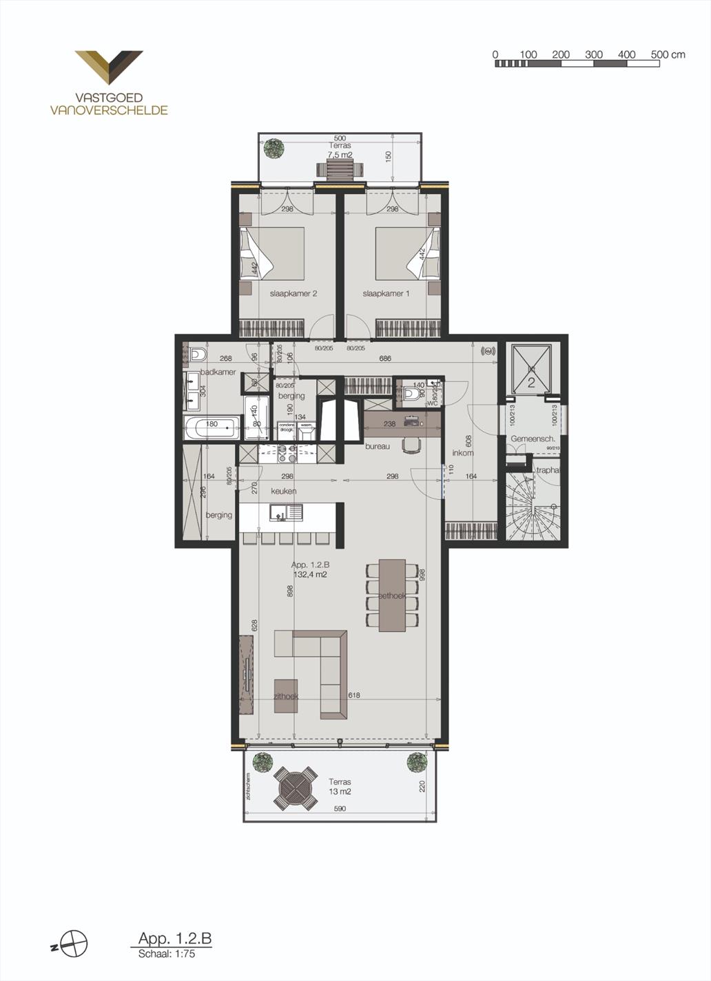 Gemeenschappelijke inkomhal - inkomhal appartement met vestiaireruimte - apart toilet - 2 slaapkamers (13,5m² en 13,5m²) - ingerichte badkamer (8,5m²) - 2 praktische bergingen (7,5m²) - lichtrijke leefruimte (58m²) met open ingerichte keuken - 2 grote terrassen (13m² en 7,5m²).