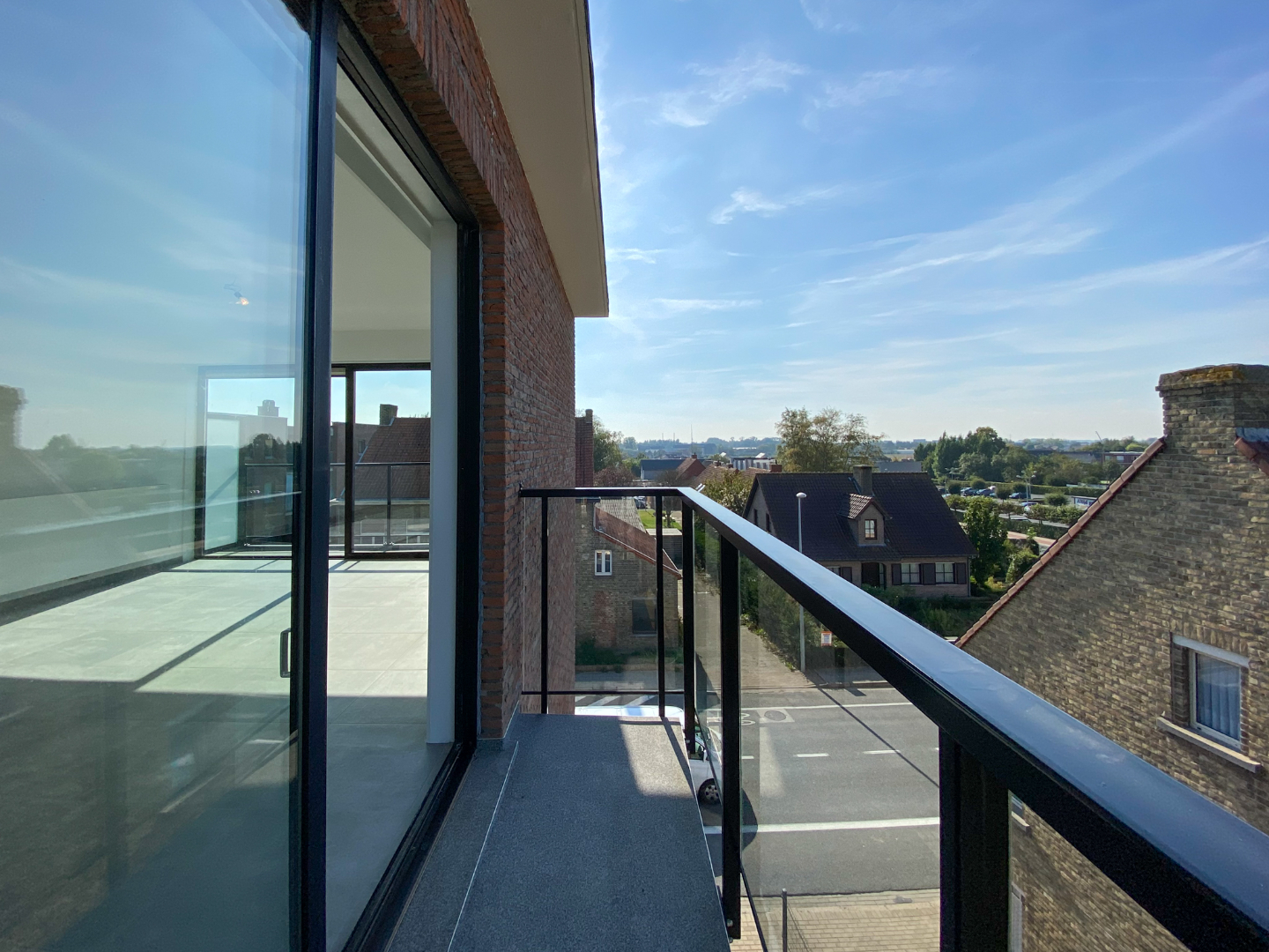 Inkomhal appartement - apart toilet - 2 slaapkamers - badkamer - lichtrijke leefruimte - keuken - 3 terrassen.