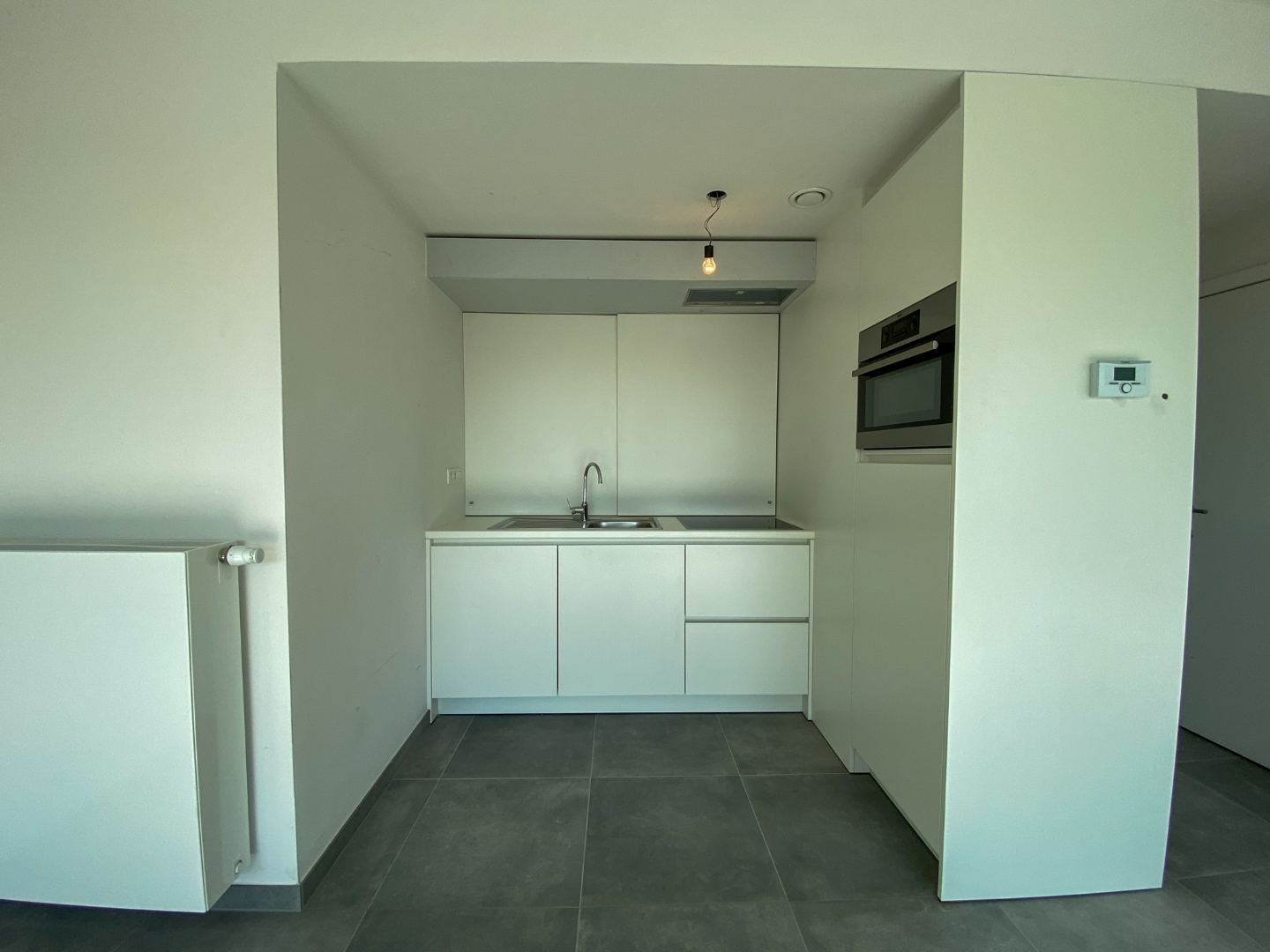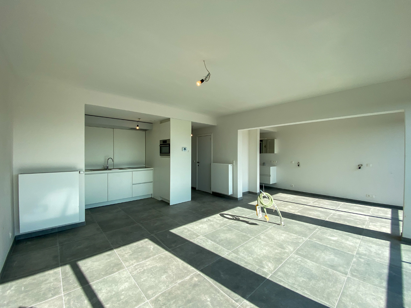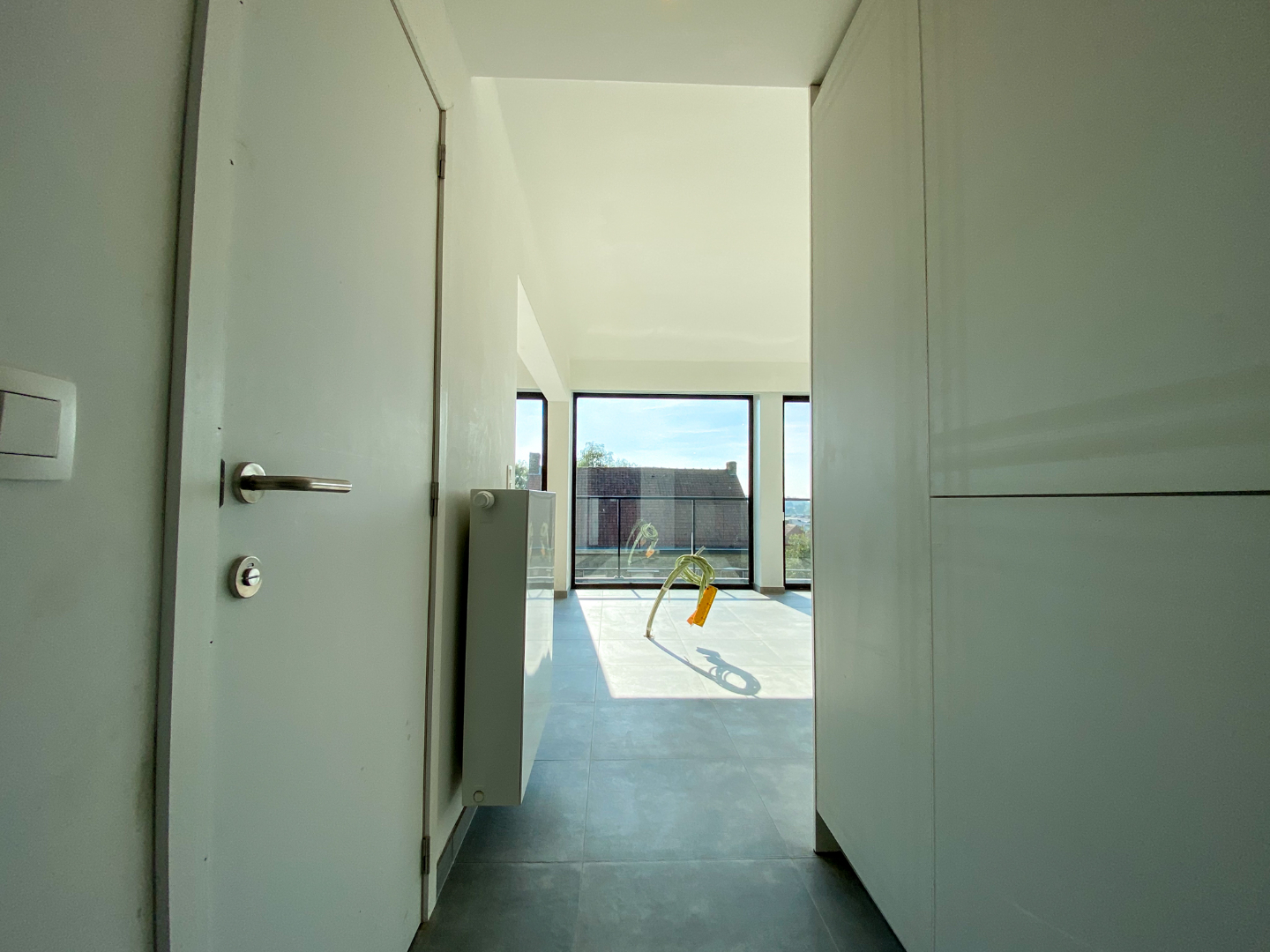 Inkomhal appartement - badkamer - lichtrijke leefruimte - keuken - slaapkamer - ruim terras.