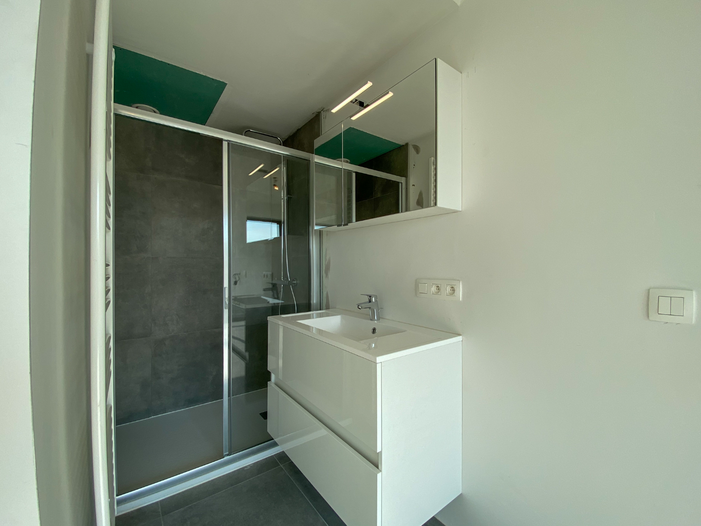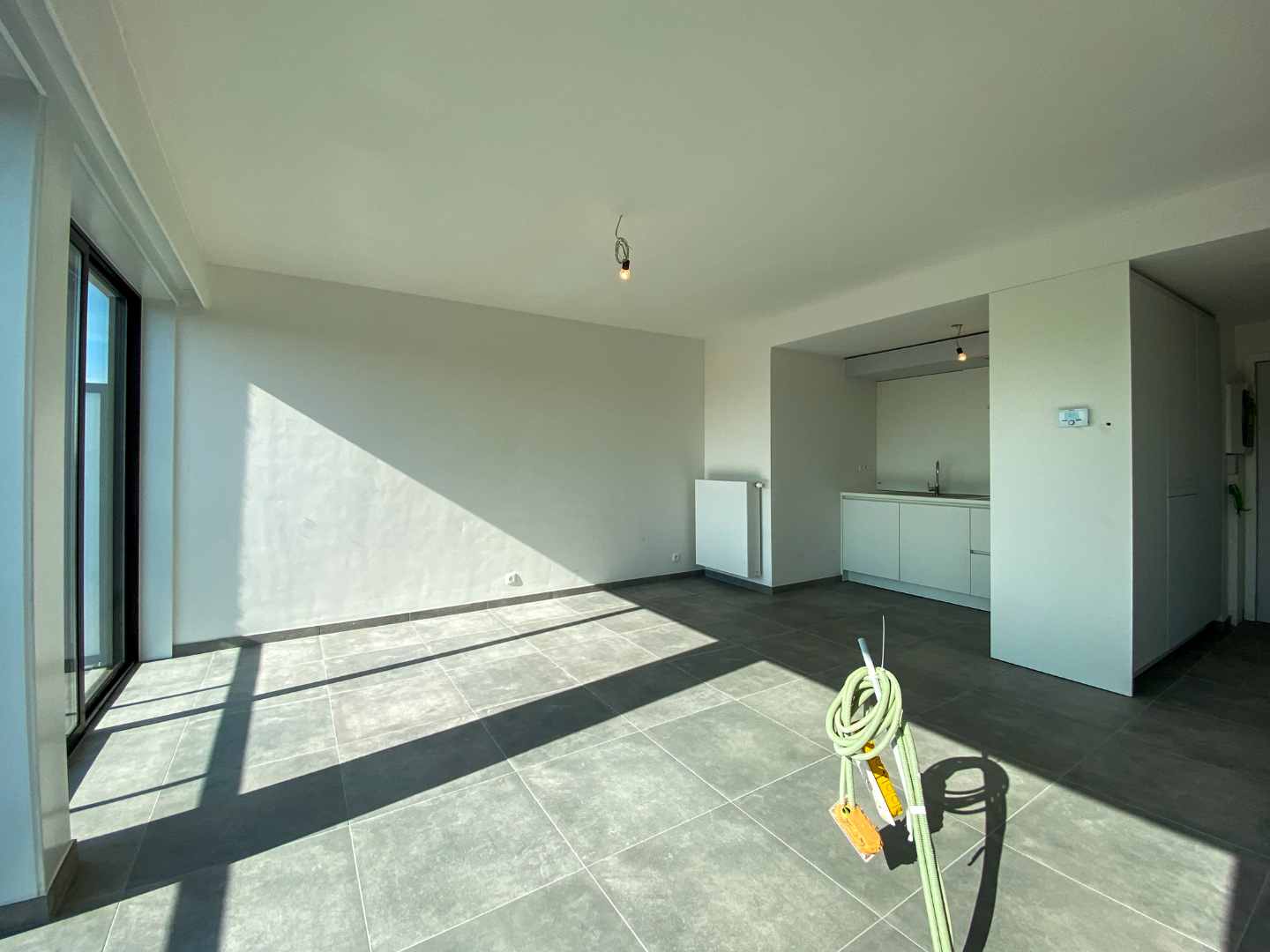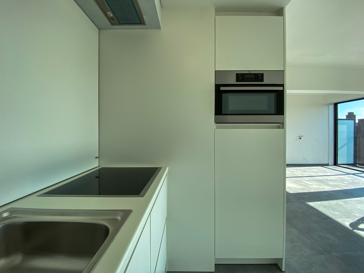 Inkomhal appartement - badkamer - lichtrijke leefruimte - keuken - slaapkamer - ruim terras.