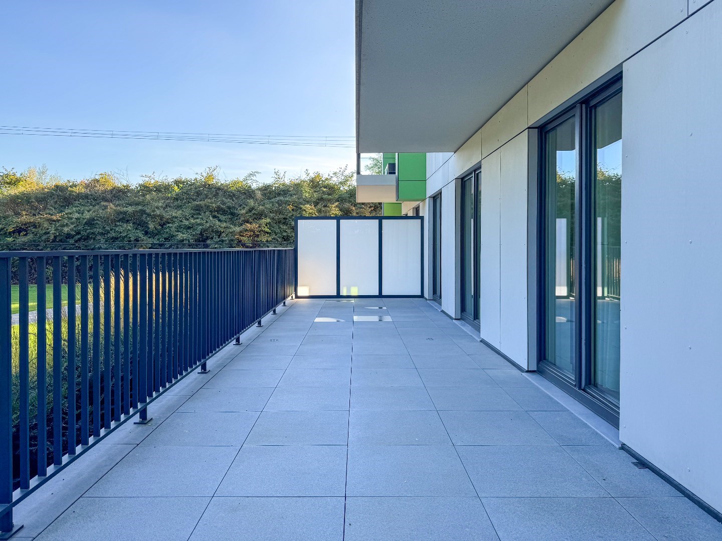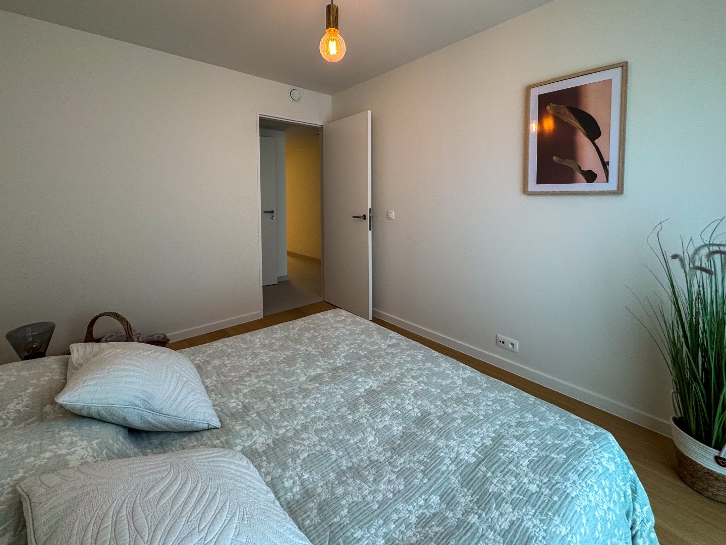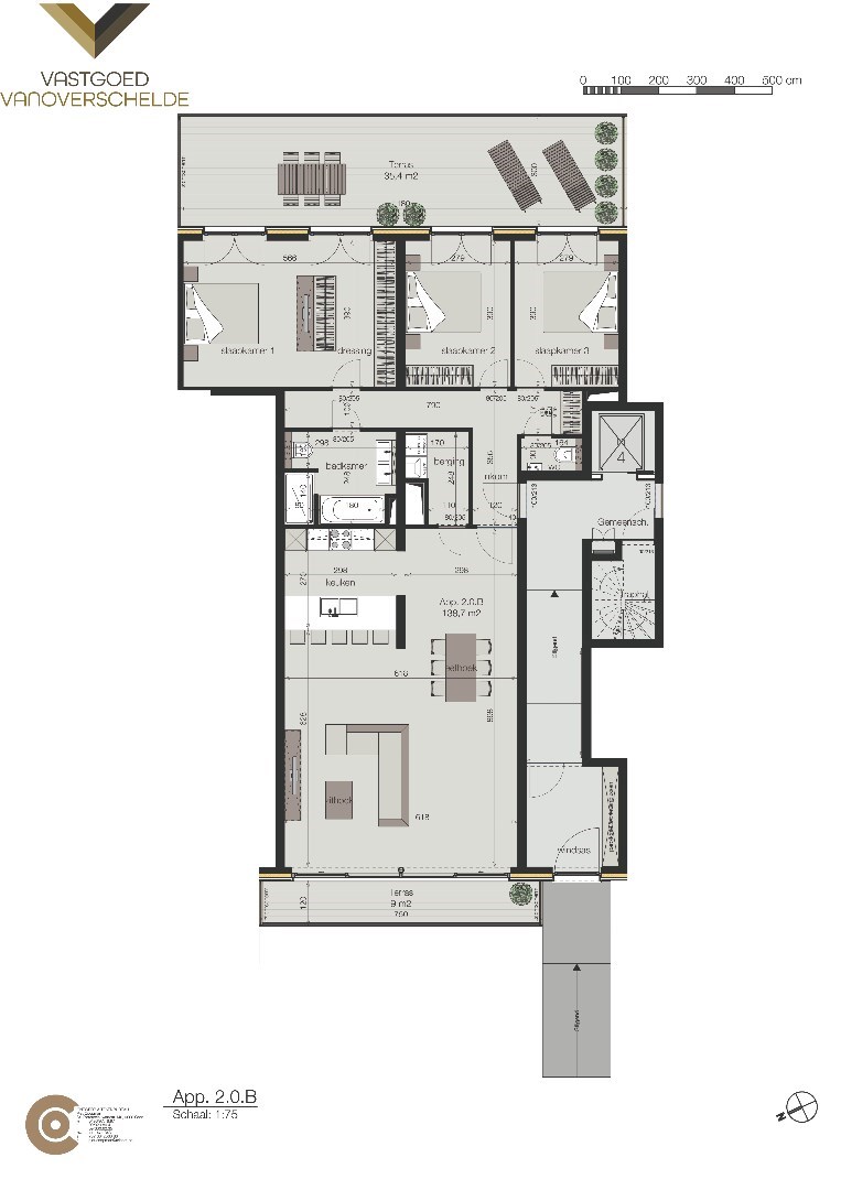 Gemeenschappelijke inkomhal - inkomhal appartement met vestiaireruimte - apart toilet - 3 slaapkamers (22m², 11m² en 11m²) - ingerichte badkamer (7,5m²) - praktische berging (4m²) - lichtrijke leefruimte (55,5m²) met open ingerichte keuken - 2 grote terrassen (35,4m² en 9m²).