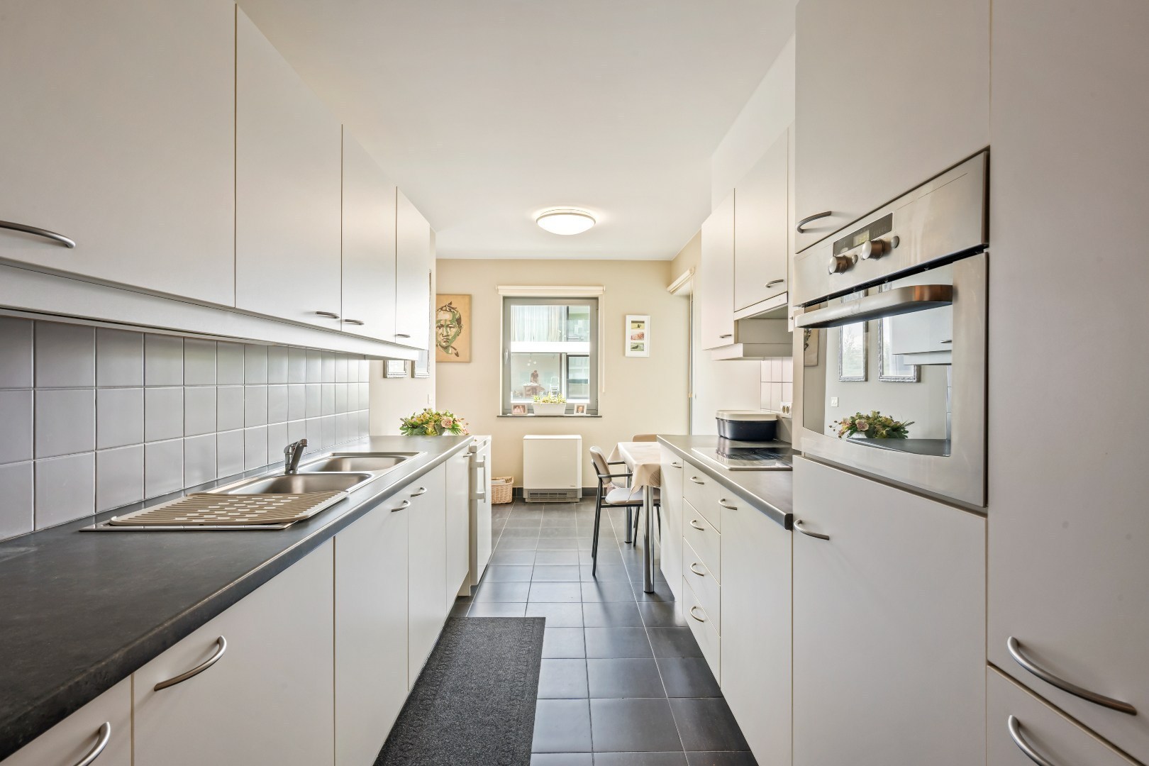 Inkomhal - apart toilet - ingerichte badkamer met instapdouche en lavabomeubel - slaapkamer 1 met terras - woonkamer met open ingerichte keuken, bevat onder andere een koelkast, elektrische kookplaat, dampkap, combi-oven en dubbele spoelbak - slaapkamer 2 met terras.