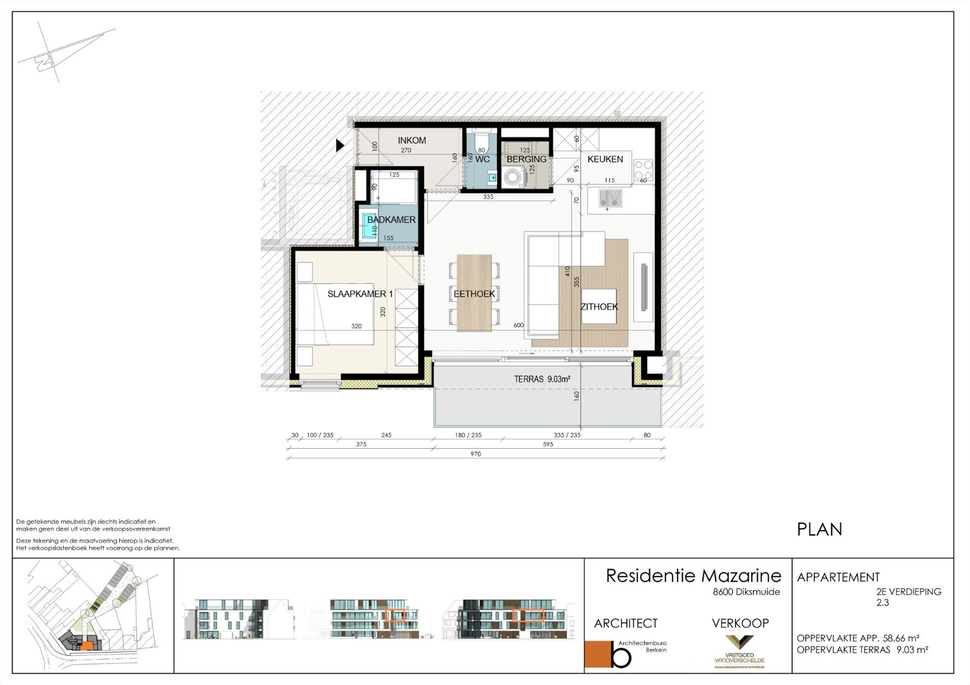 De appartementen variëren van 58m2 tot 122m2 en beschikken over 1,2 of 3 slaapkamers al dan niet met terrassen die variëren van 9m2 tot 59m2. Tevens zijn er 13 achterliggende garages aanwezig die toegankelijk zijn via de doorrit op de gelijkvloerse verdieping.