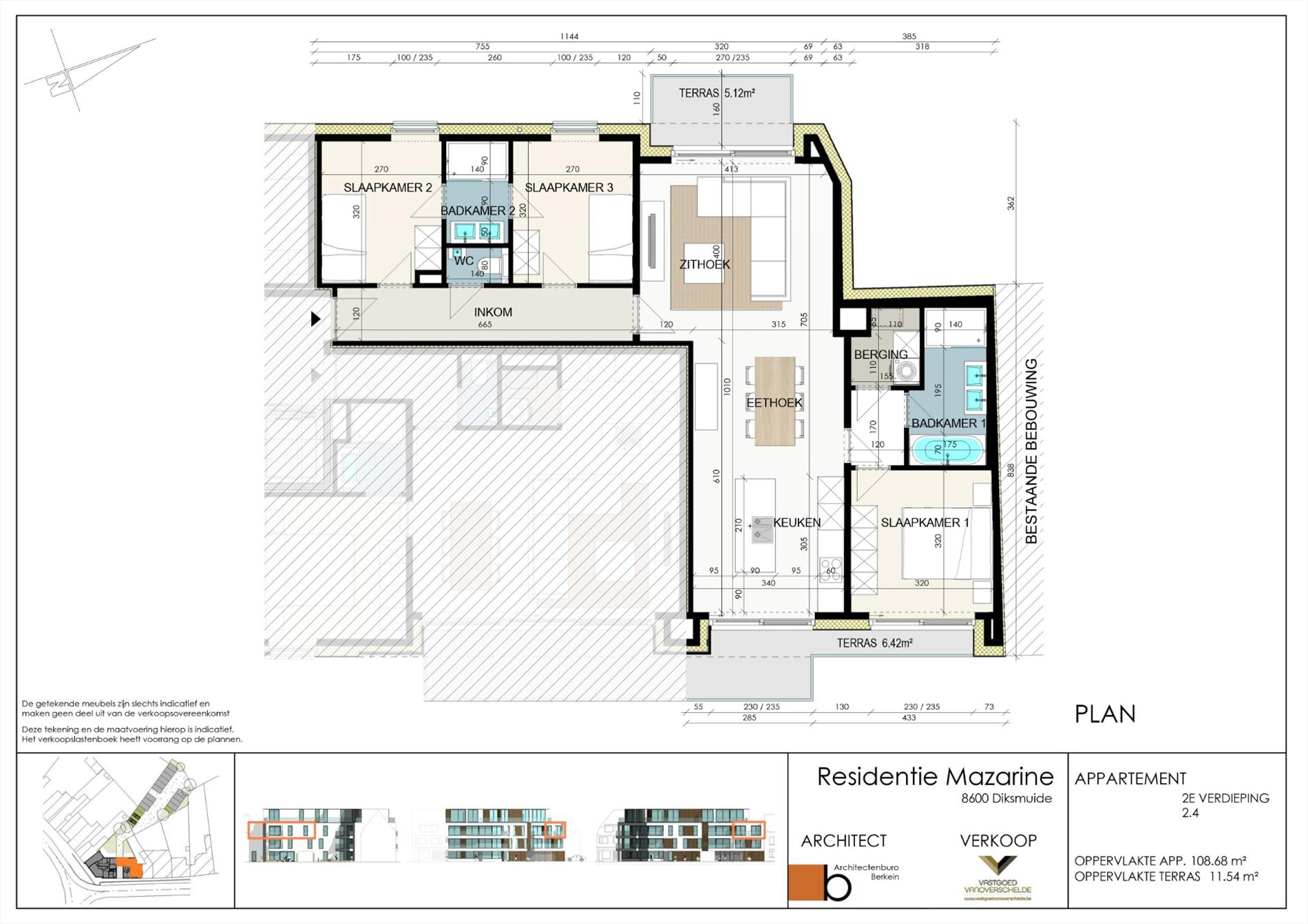 De appartementen variëren van 58m2 tot 122m2 en beschikken over 1,2 of 3 slaapkamers al dan niet met terrassen die variëren van 9m2 tot 59m2. Tevens zijn er 13 achterliggende garages aanwezig die toegankelijk zijn via de doorrit op de gelijkvloerse verdieping.