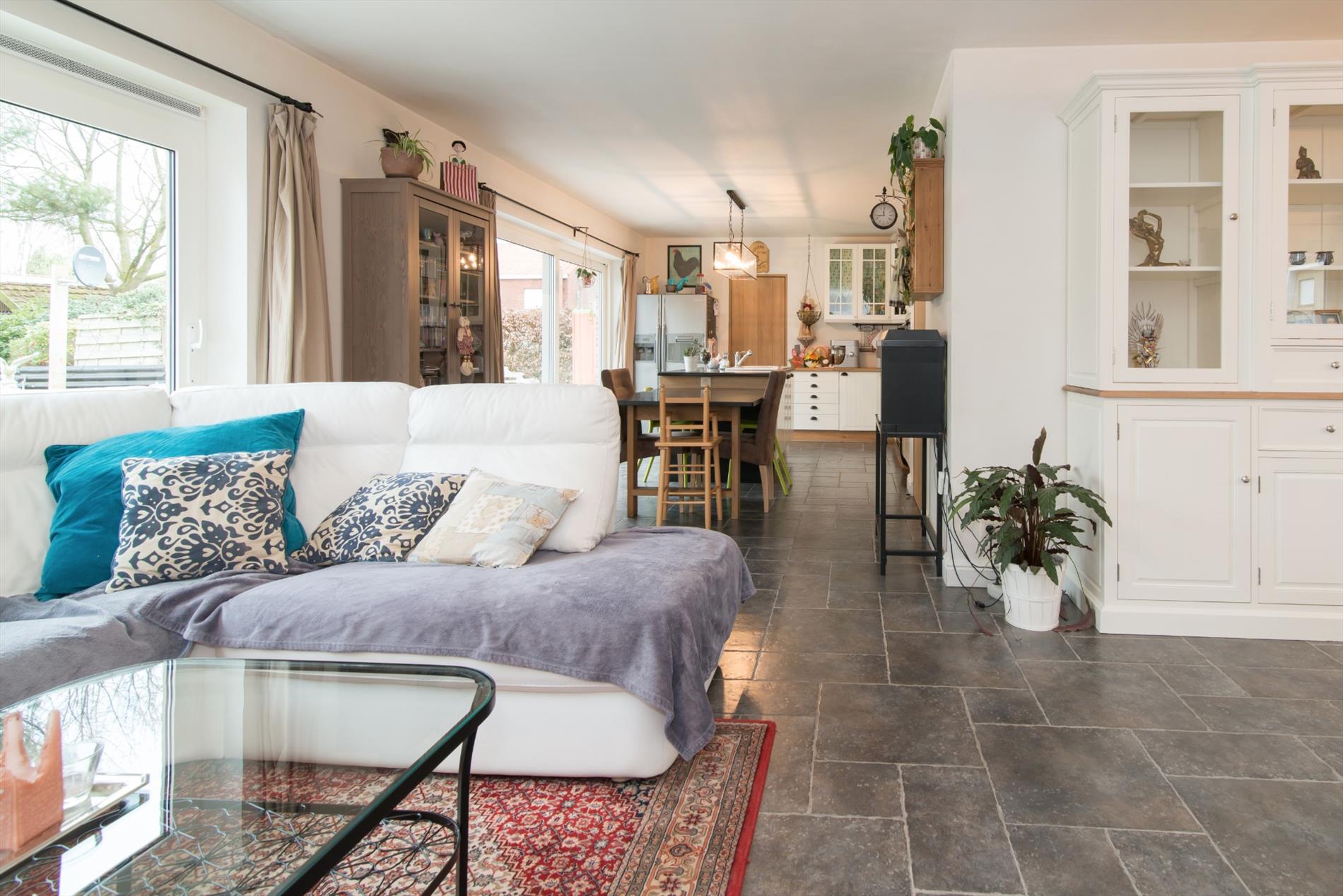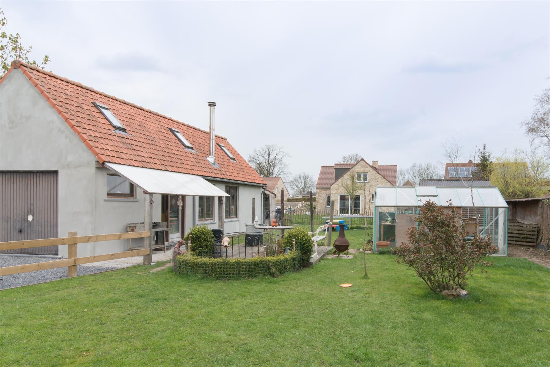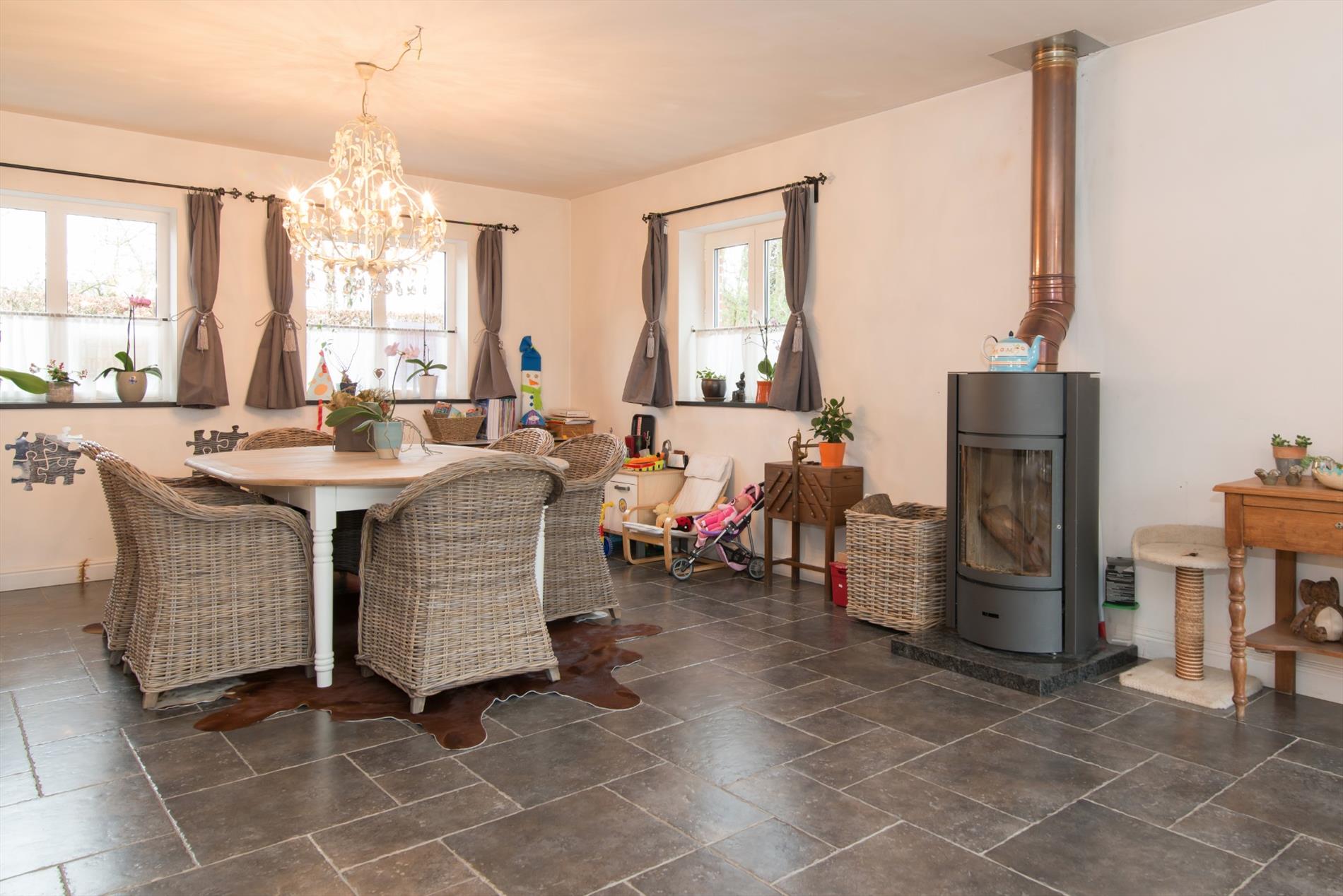 Inkomhal - apart gastentoilet - leefruimte met open haard - open ingerichte keuken met eiland en marmeren werkblad bevat o.a. vaatwas, dubbele spoelbak, elektrische kookplaat, dampkap, oven - berging- en wasruimte met lavabo - ingerichte badkamer met dubbele wastafel, toilet, ligbad en inloopdouche - ruime oprit - tuin met terras - bijgebouw met geïntegreerde dubbele garage en zoldering. (alle nutsvoorzieningen aanwezig)