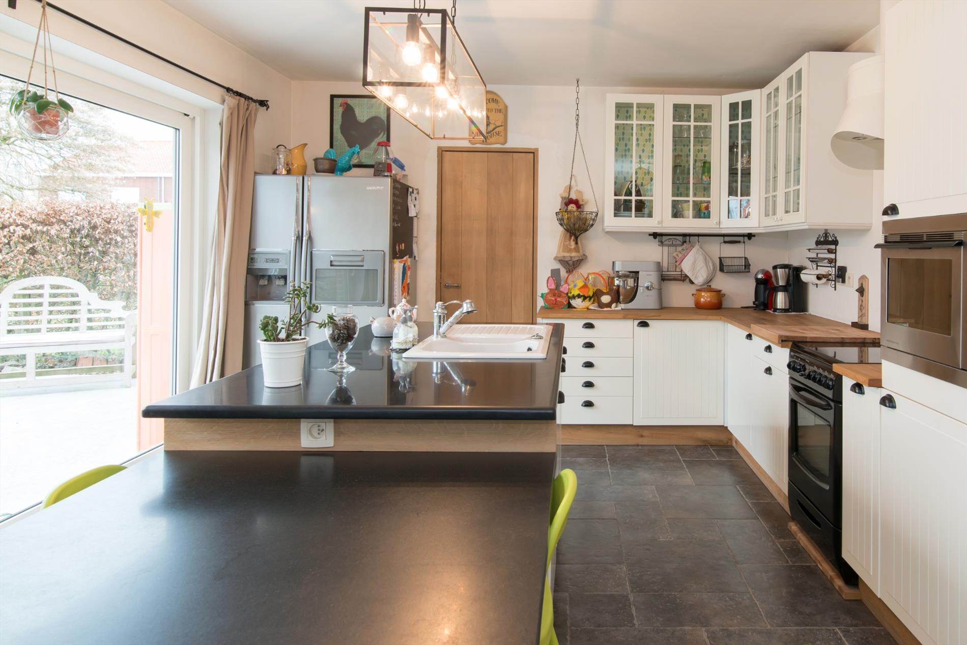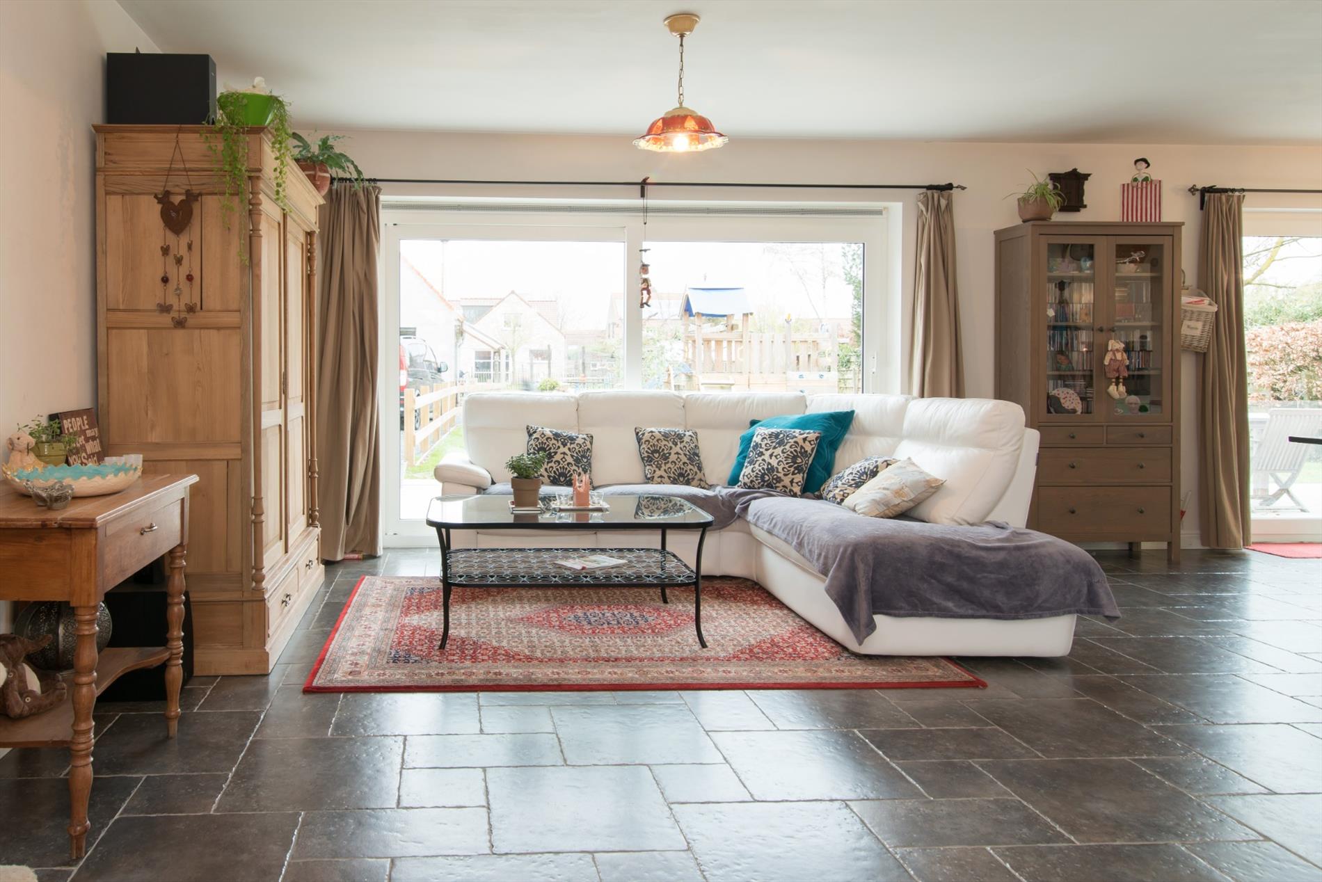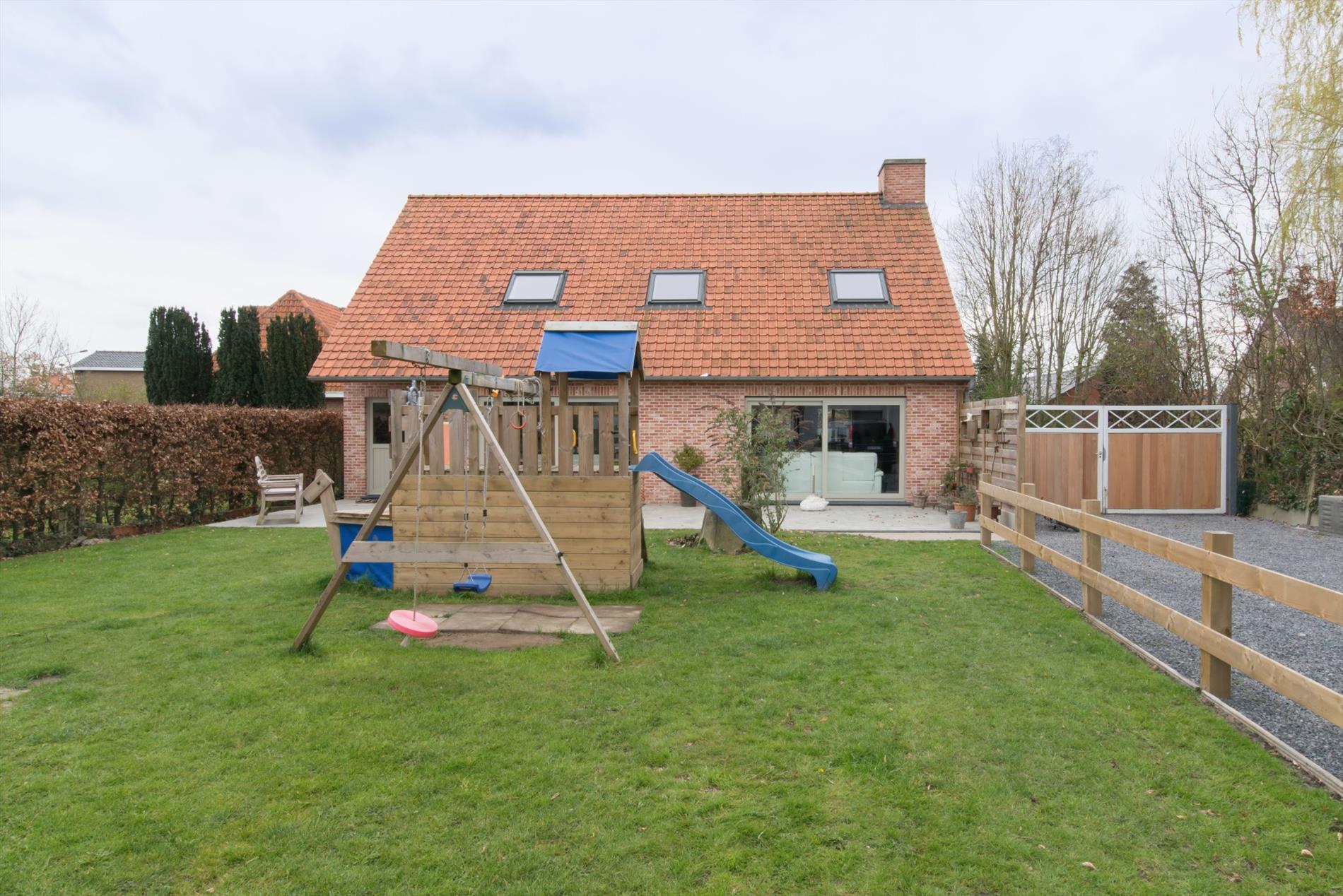 Inkomhal - apart gastentoilet - leefruimte met open haard - open ingerichte keuken met eiland en marmeren werkblad bevat o.a. vaatwas, dubbele spoelbak, elektrische kookplaat, dampkap, oven - berging- en wasruimte met lavabo - ingerichte badkamer met dubbele wastafel, toilet, ligbad en inloopdouche - ruime oprit - tuin met terras - bijgebouw met geïntegreerde dubbele garage en zoldering. (alle nutsvoorzieningen aanwezig)