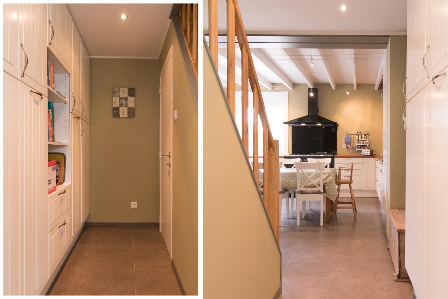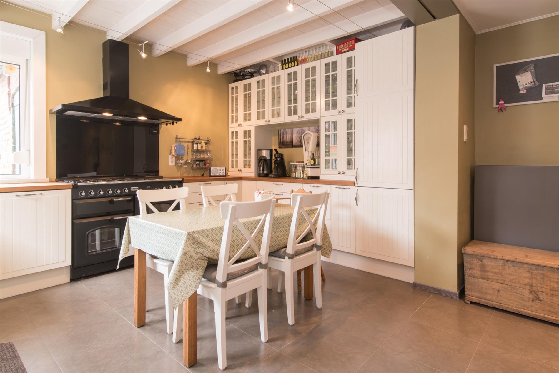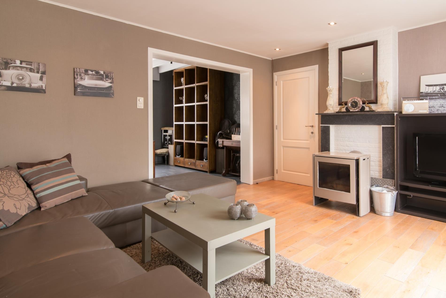 Inkomhal - eetplaats - leefruimte met parketvloer en houtkachel - open ingerichte keuken met o.a. een Falcon fornuis (5 gasbranders, wokbrander, heteluchtoven en grillruimte) , vaatwas, dubbele spoelbak, dampkap, ingebouwde koelkast en diepvries - bergruimte nabij de keuken met tal van ingemaakte kasten - kelder - wasruimte - apart toilet - ingerichte badkamer met instapdouche en dubbele wastafel - berging/bureau - zolderruimte.