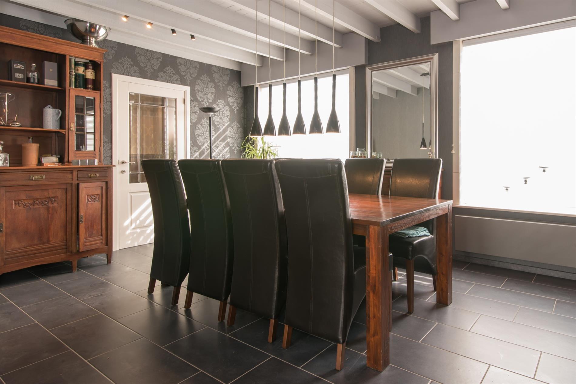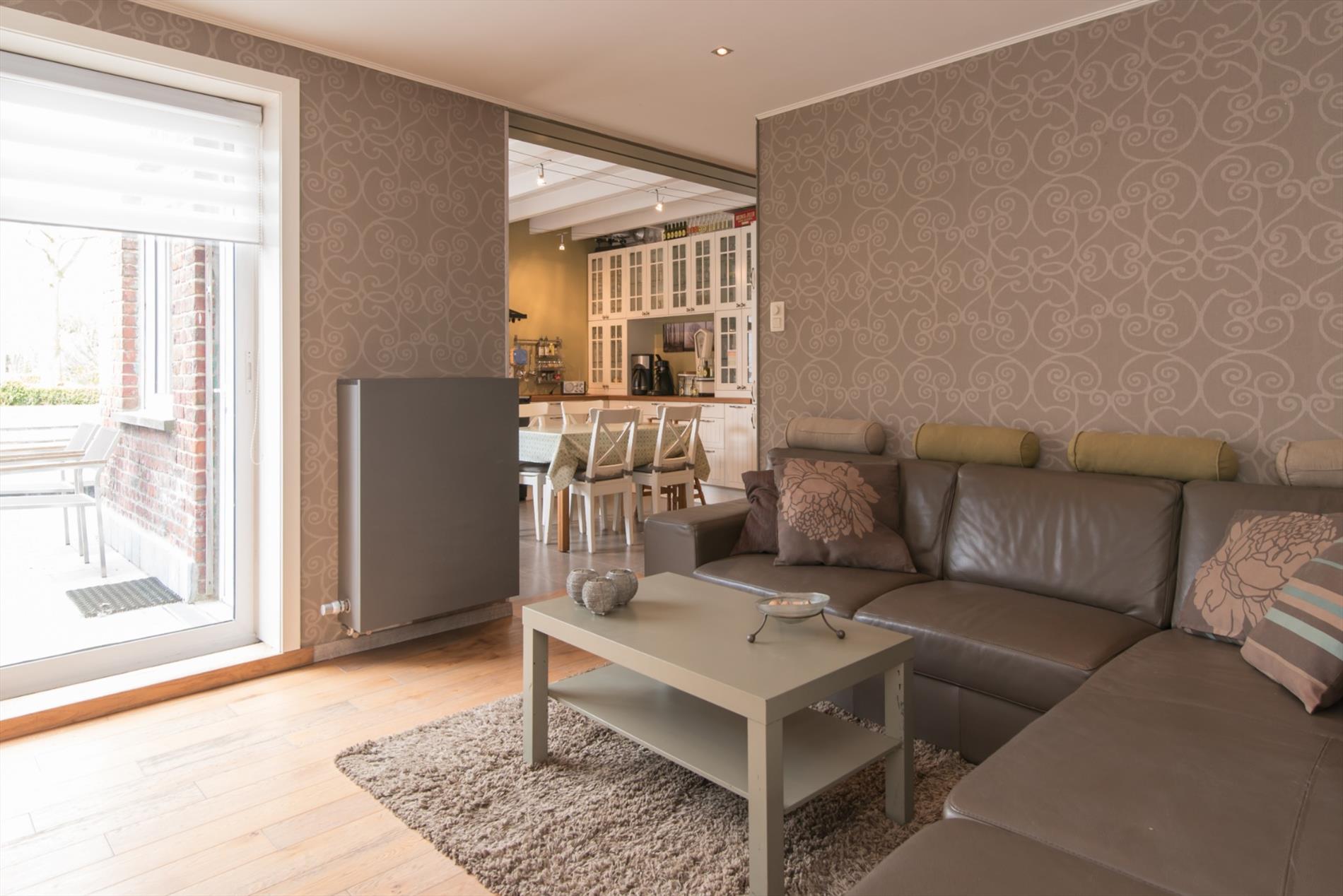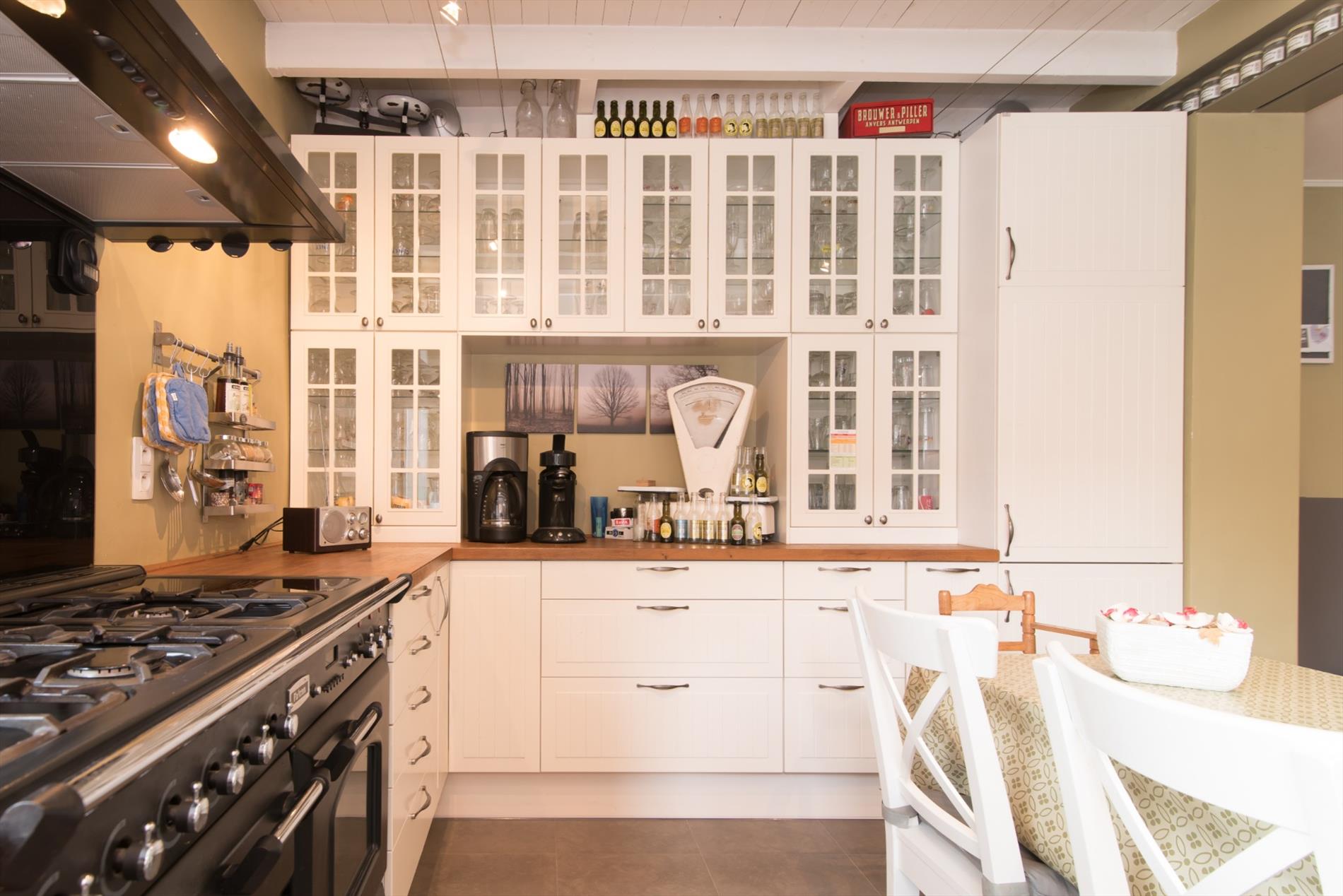Inkomhal - eetplaats - leefruimte met parketvloer en houtkachel - open ingerichte keuken met o.a. een Falcon fornuis (5 gasbranders, wokbrander, heteluchtoven en grillruimte) , vaatwas, dubbele spoelbak, dampkap, ingebouwde koelkast en diepvries - bergruimte nabij de keuken met tal van ingemaakte kasten - kelder - wasruimte - apart toilet - ingerichte badkamer met instapdouche en dubbele wastafel - berging/bureau - zolderruimte.